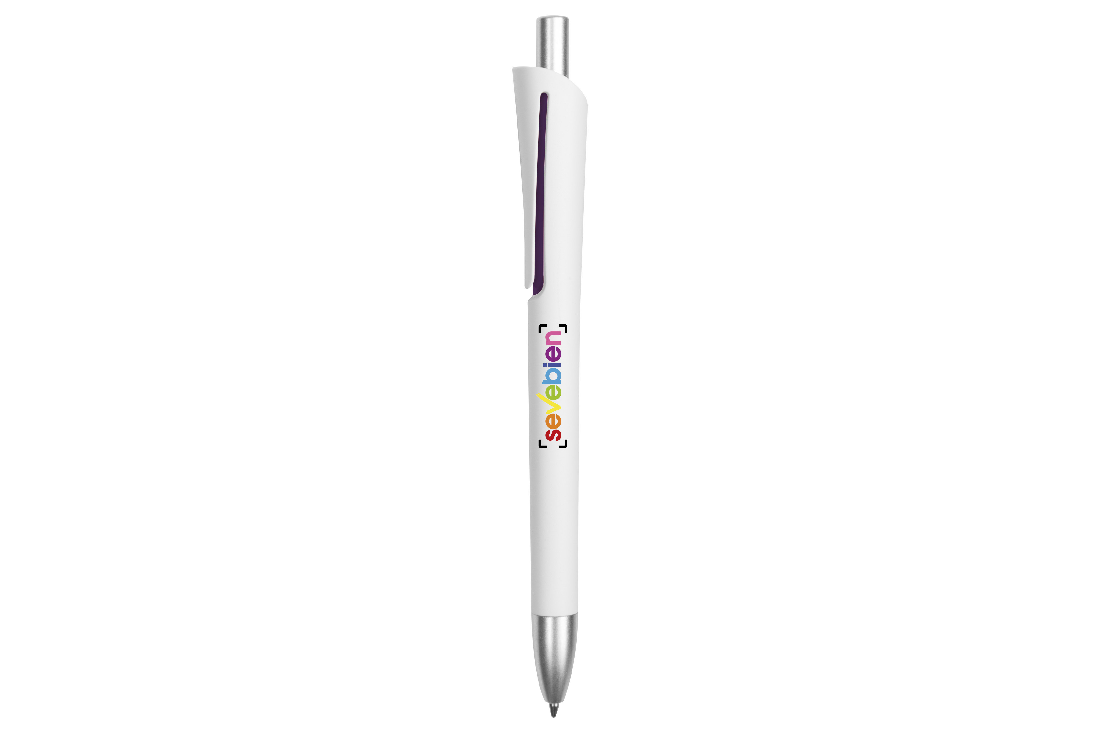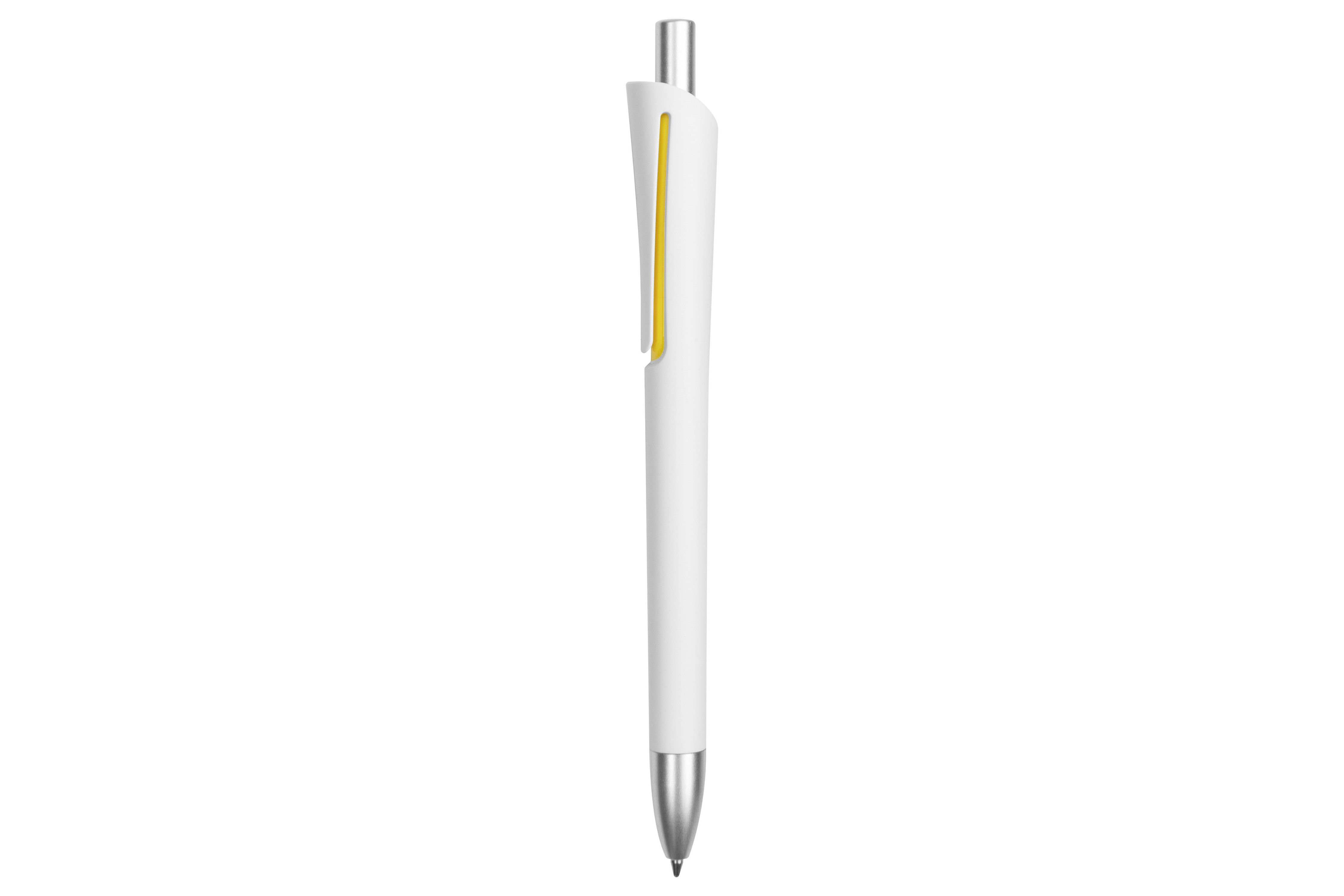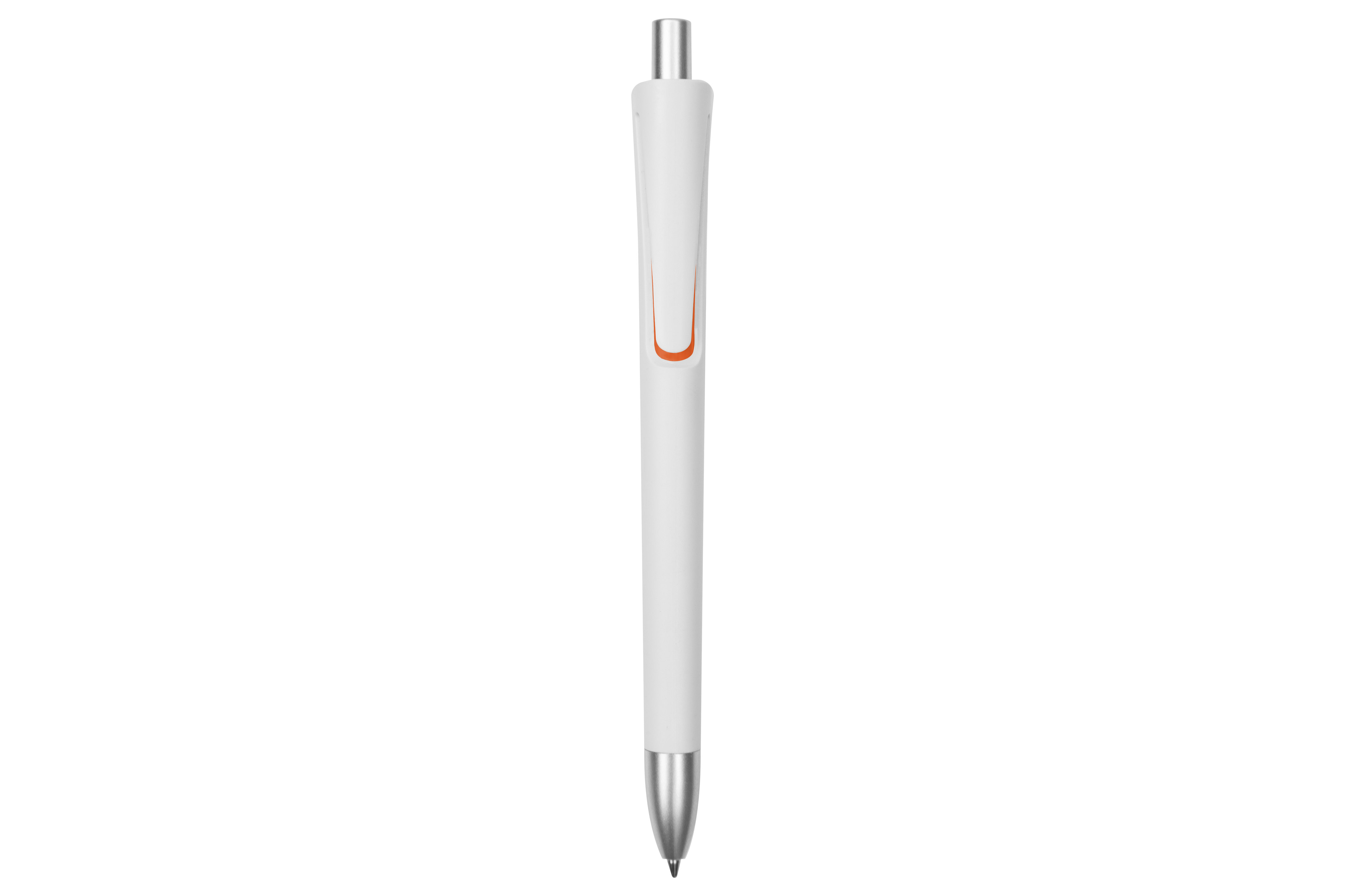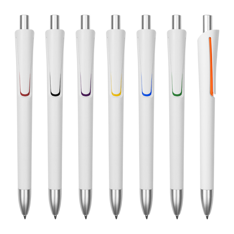 Plástico. Cuerpo blanco mate. Clip, puntera y pulsador color plata. Debajo del clip detalle de color. Tinta azul.