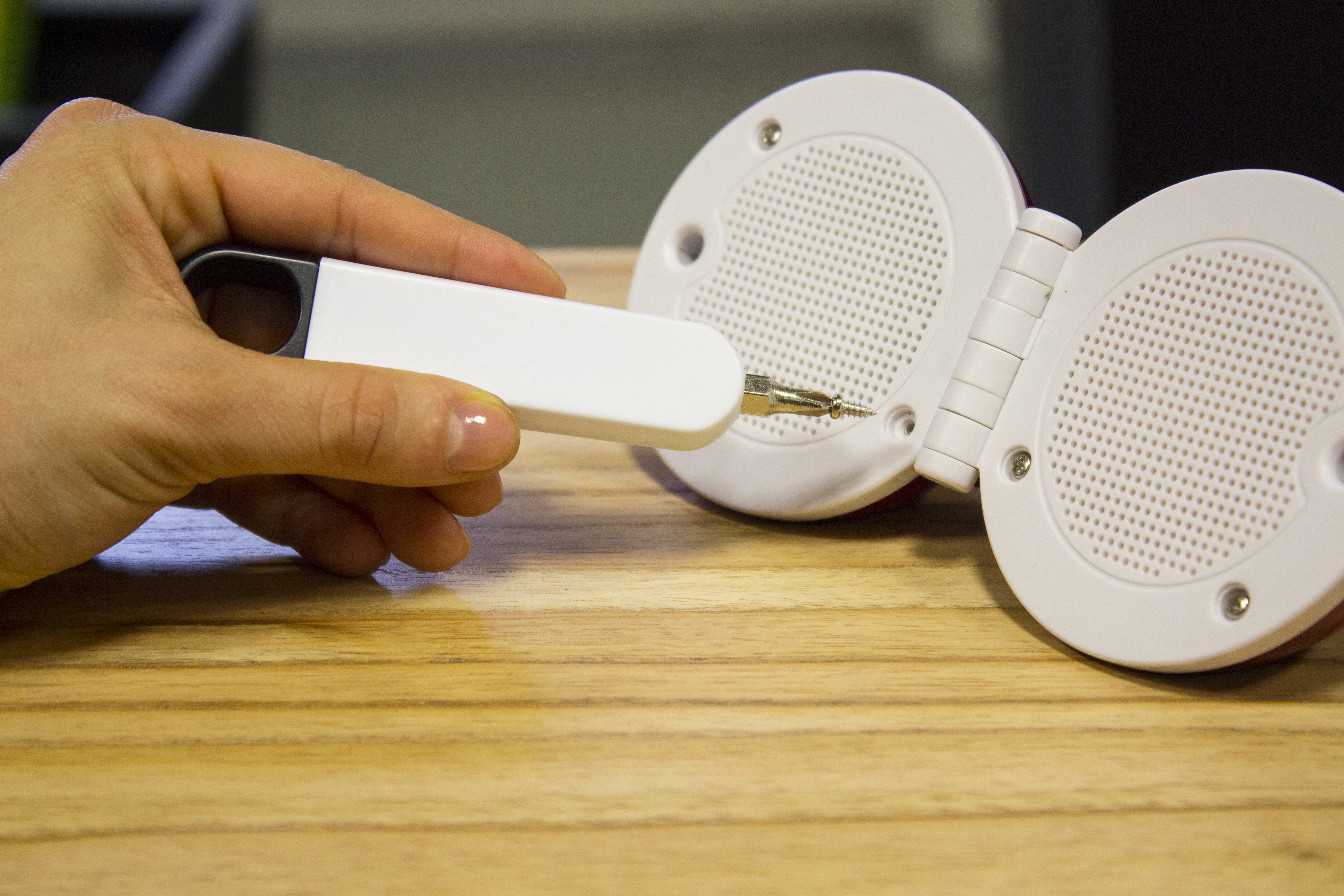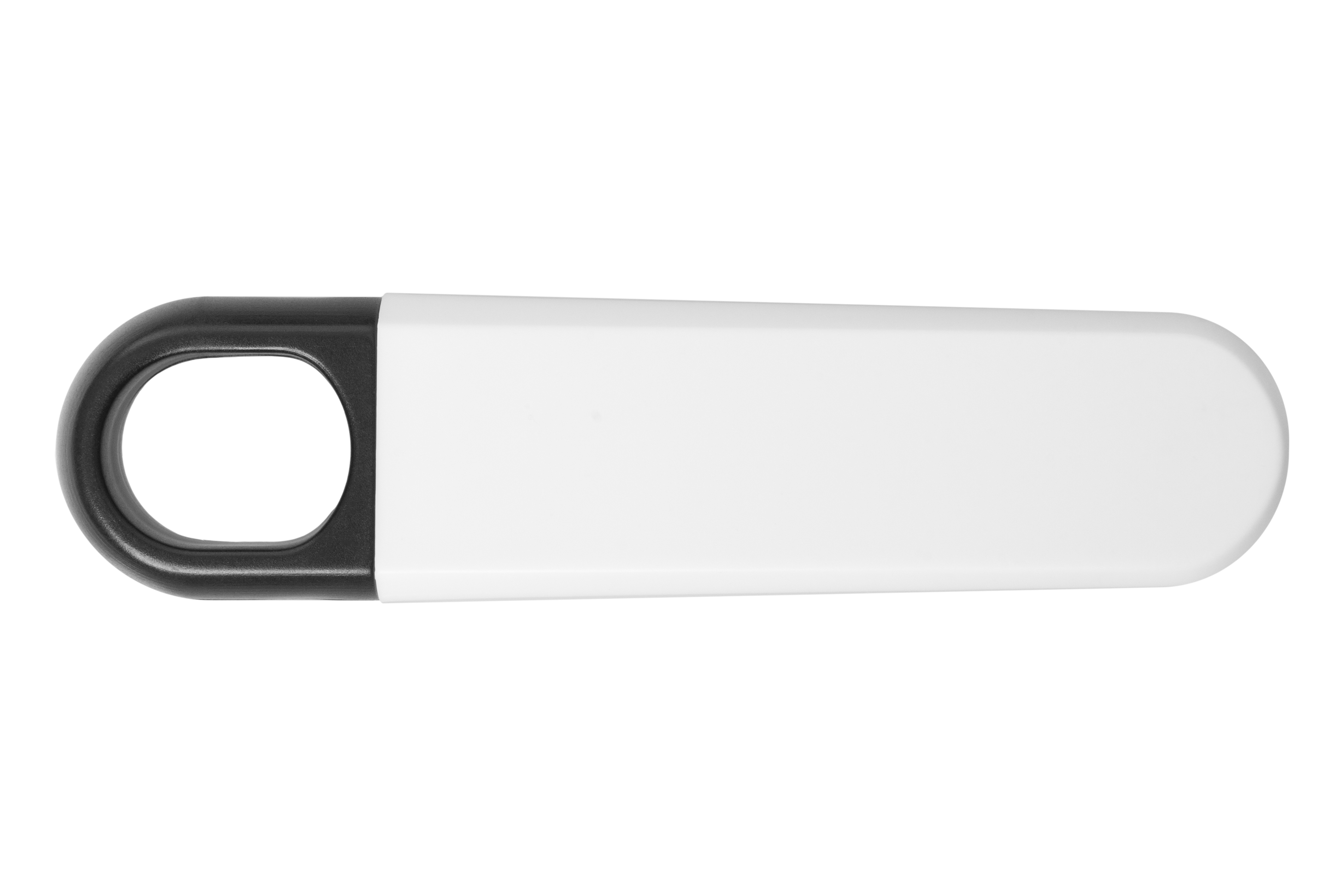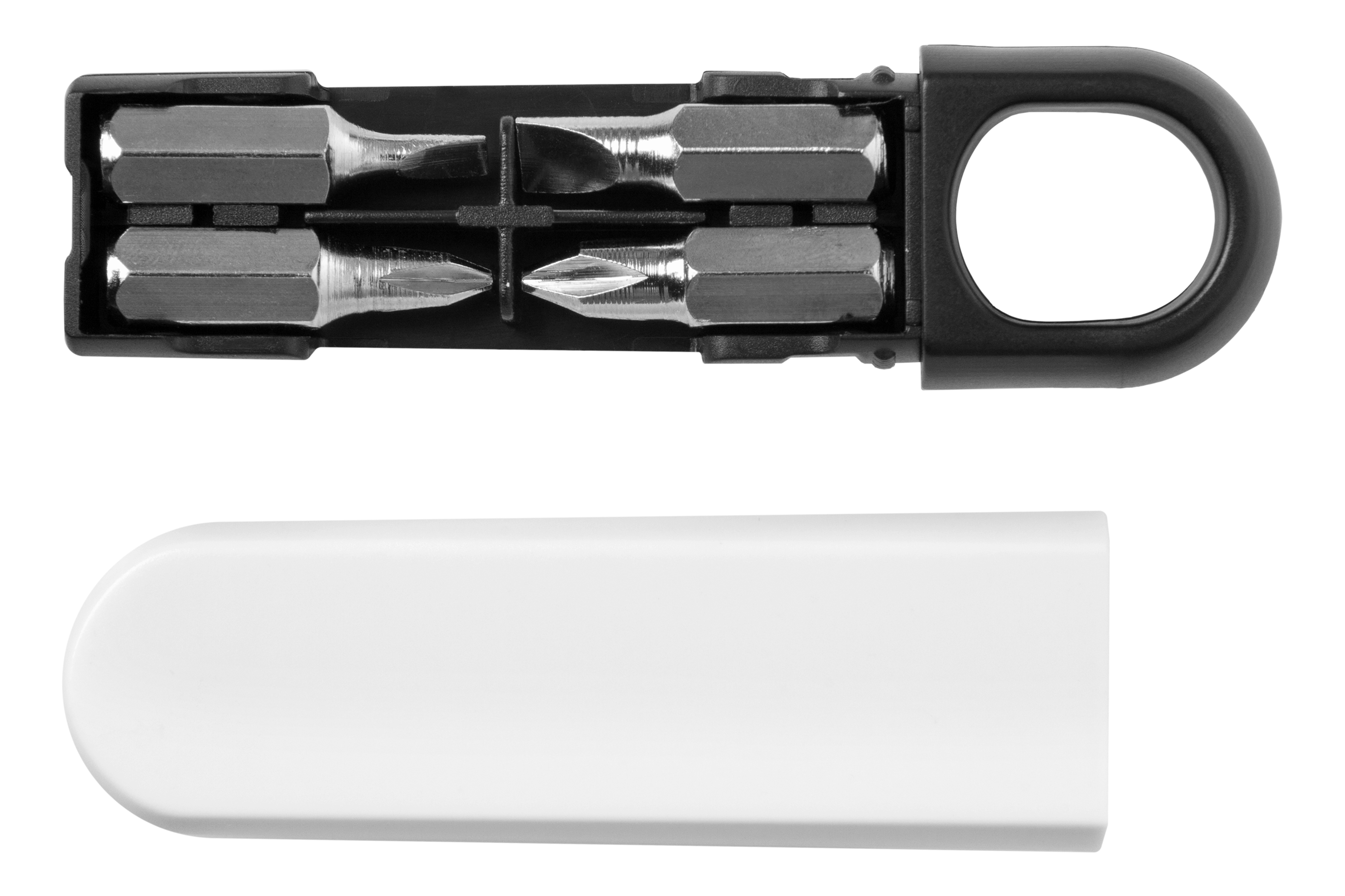 Plástico. 9 x 2 x 1,5 cm. Set de destornillador con 4 puntas intercambiables, dos planas y dos phillips que se guardan en el interior. El extremo de la tapa es imantado para el ajuste de las puntas.