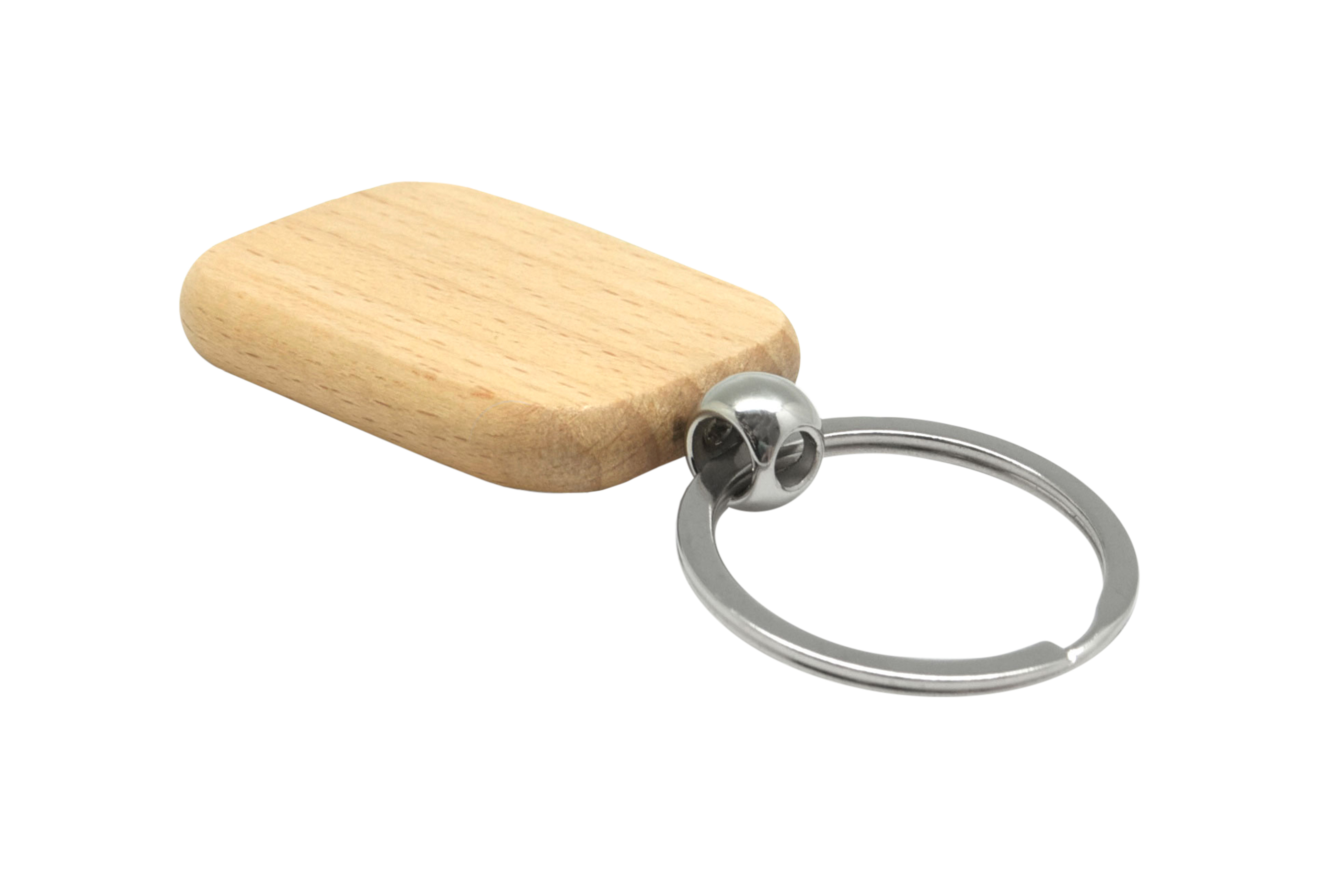 Madera. 4,2 x 3 x 0,7 cm. Llavero  rectangular con aro metálico (la medida no incluye el aro).