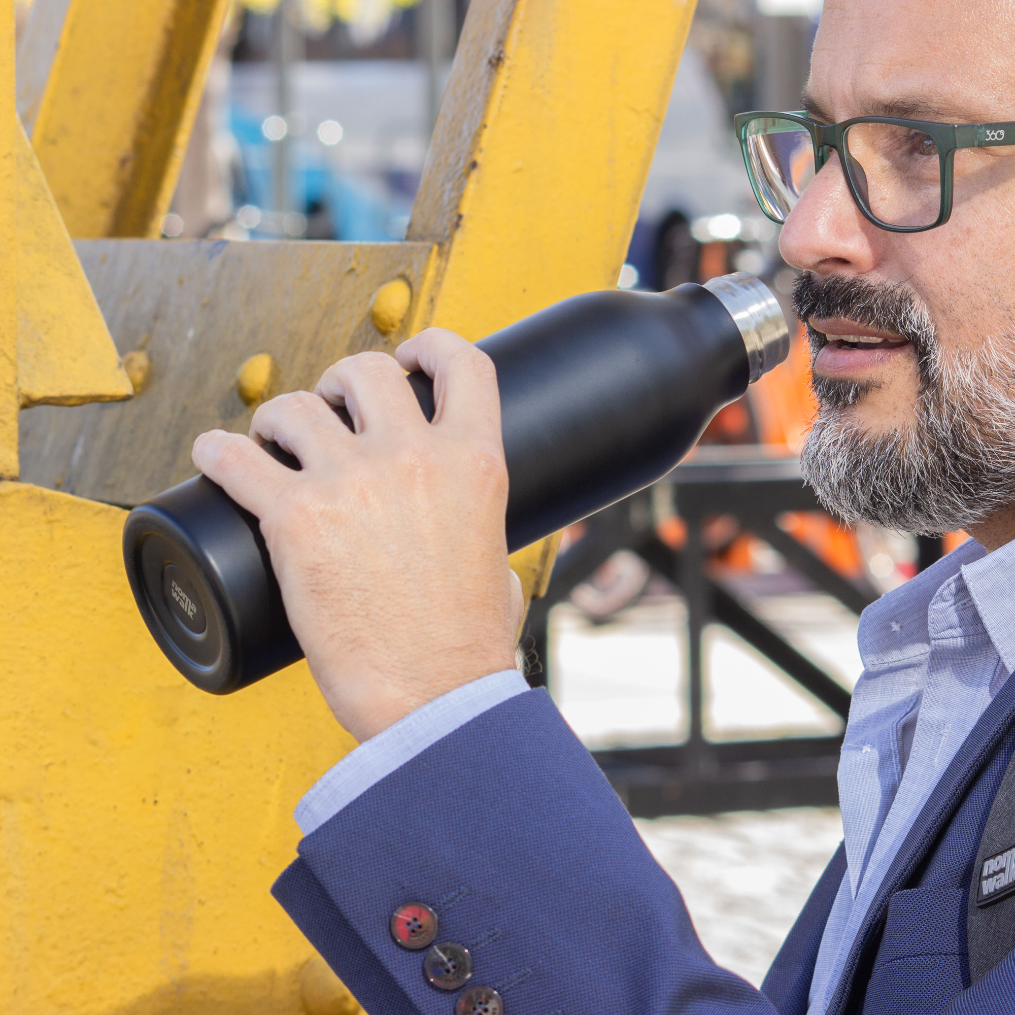 Ø 6,6 x 24,5 cm. Capacidad 500 ml. Acero inoxidable. Botella doble pared, sellada al vacío con recubrimiento de cobre. Interior de acero 304 y exterior de acero 201. Pintura color negro mate. Tapa de acero a rosca. Mantiene por más de 12 hs la temperatura de las bebidas calientes y 24 hs de las bebidas frías. Presentación en caja de regalo.