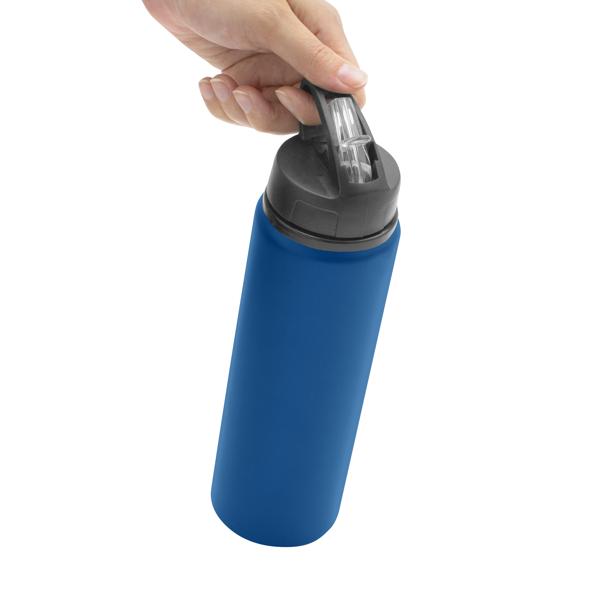 Clásica e Ideal para cualquier ocasión.Botella de aluminio con manija de agarre en la tapa, sorbete plástico y boquilla rebatible. Tapa a rosca de plástico. Medidas: Ø 7 x 25 cm.