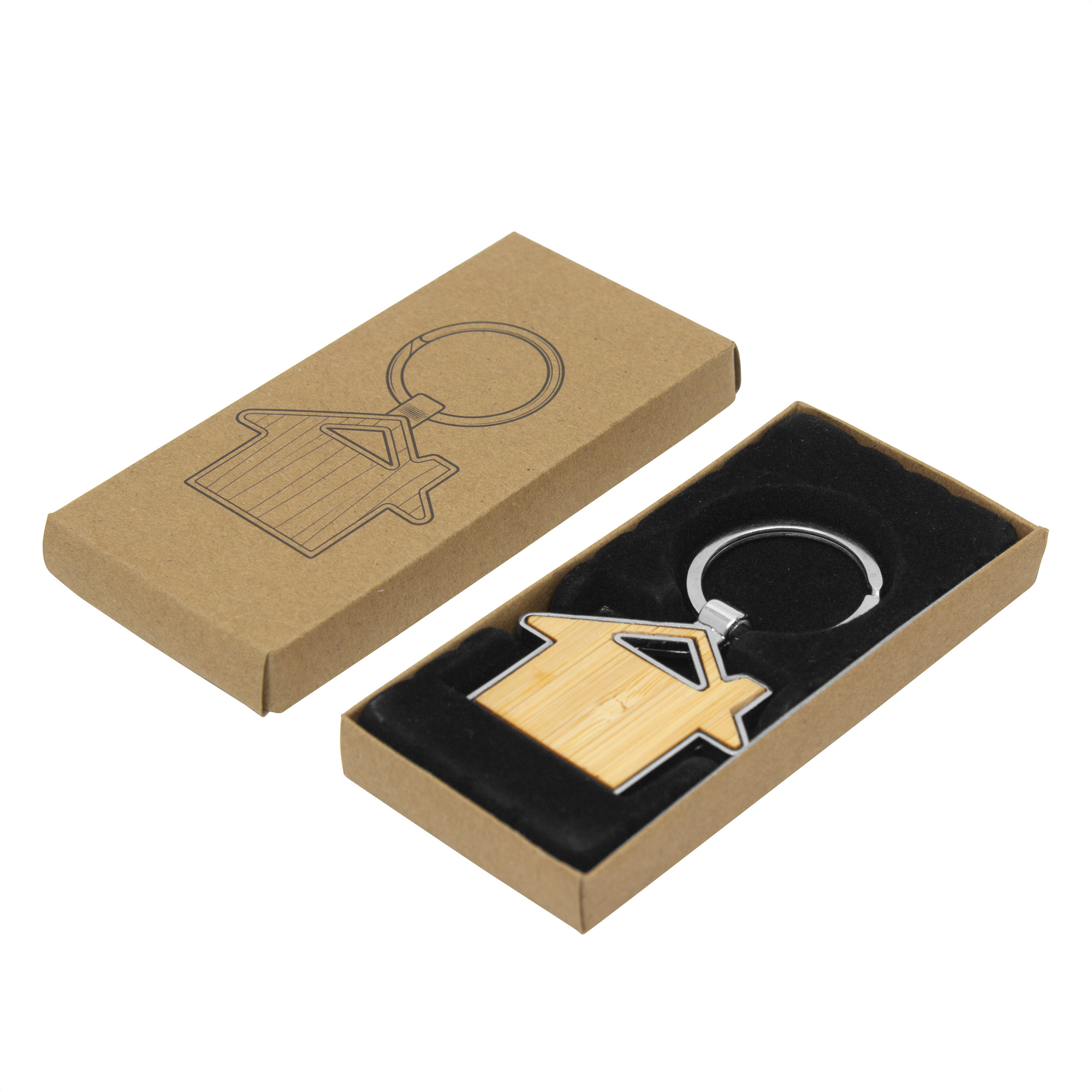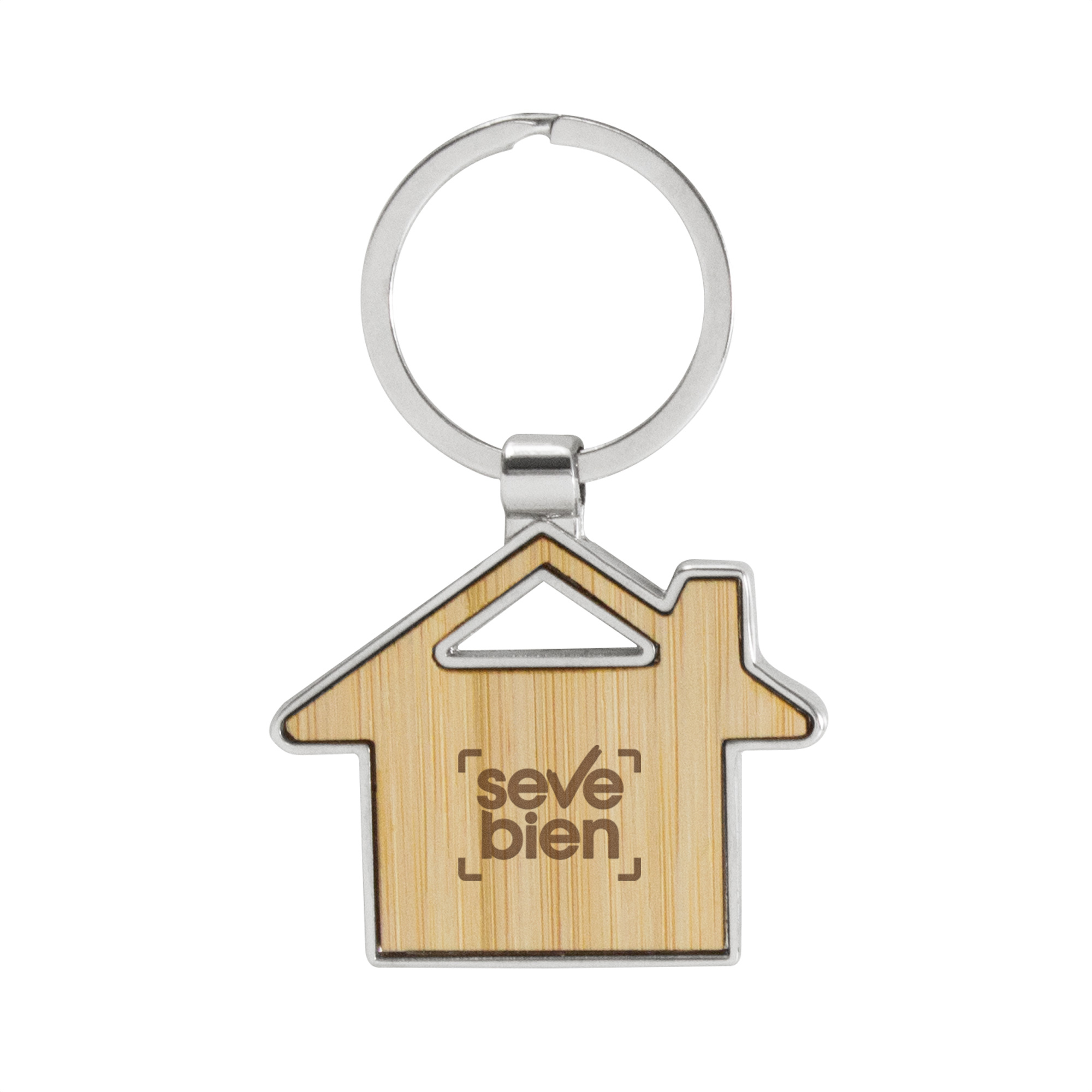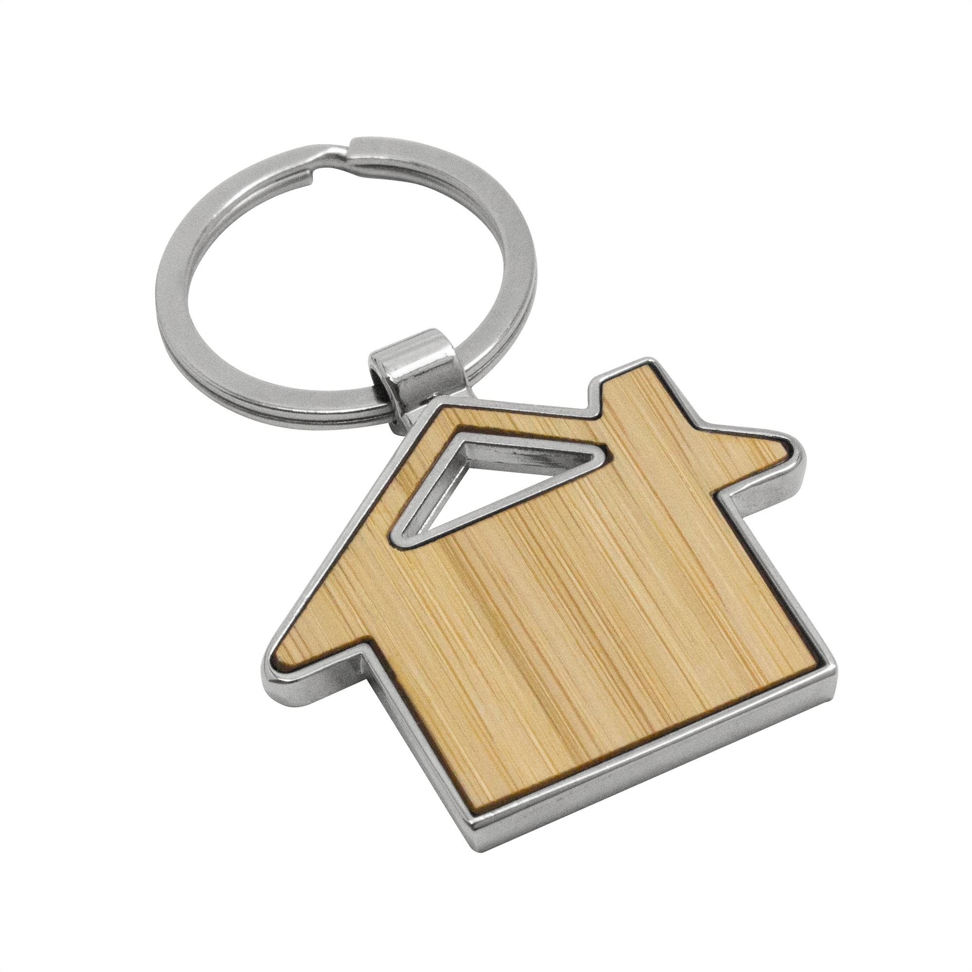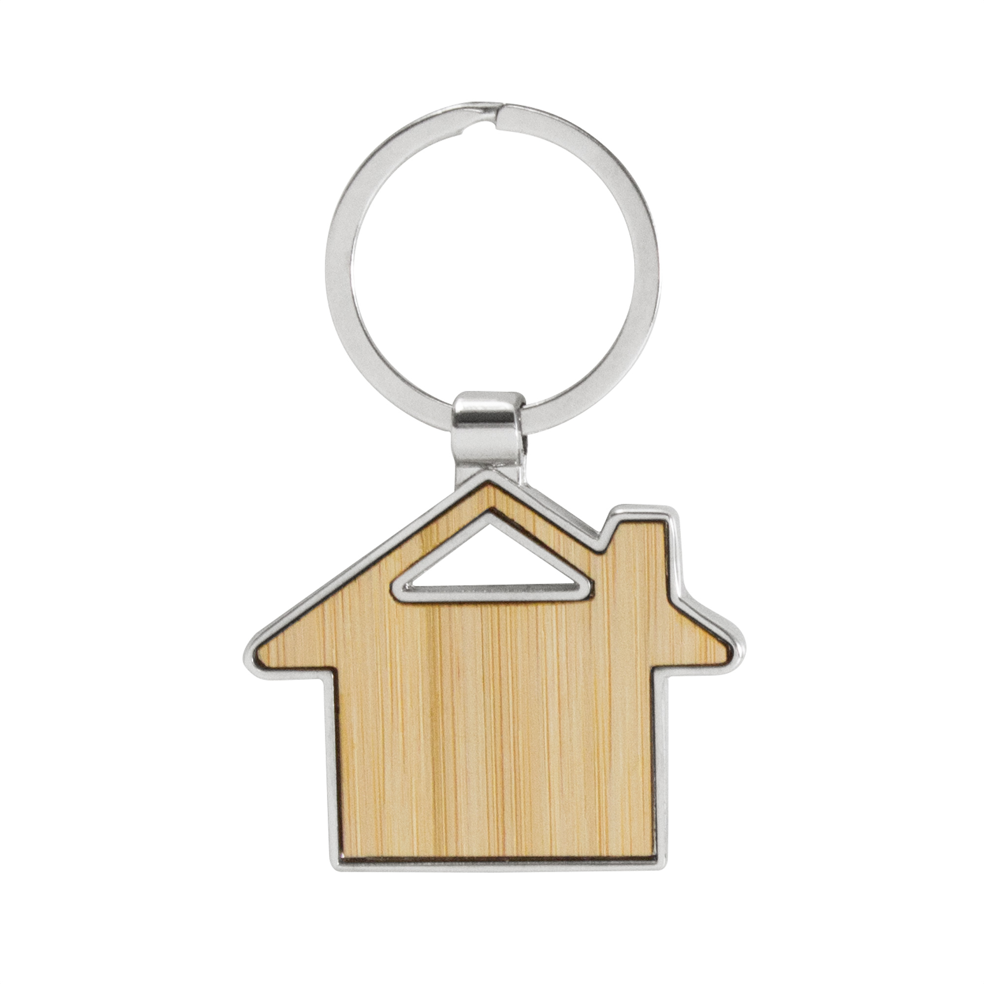 Calidez en tus llaves. Llavero con forma de casa. Estructura metálica con aleación de zinc con acabado brillante y panel frontal de bambú barnizado. Medidas: 7,5 x 4,8 x 0,7 cm.