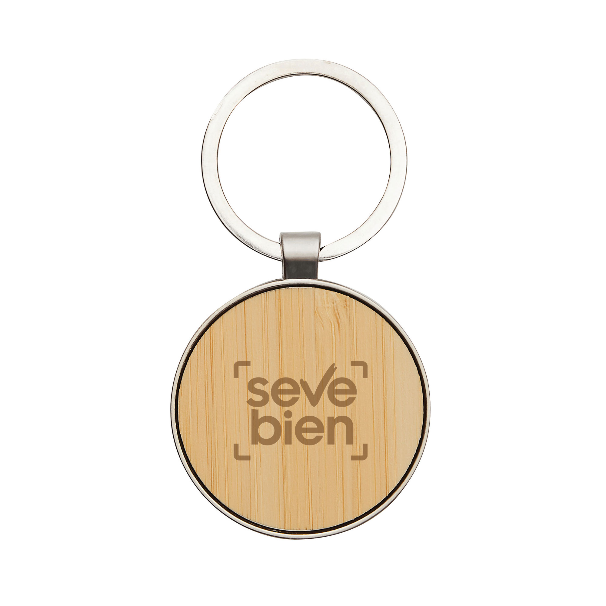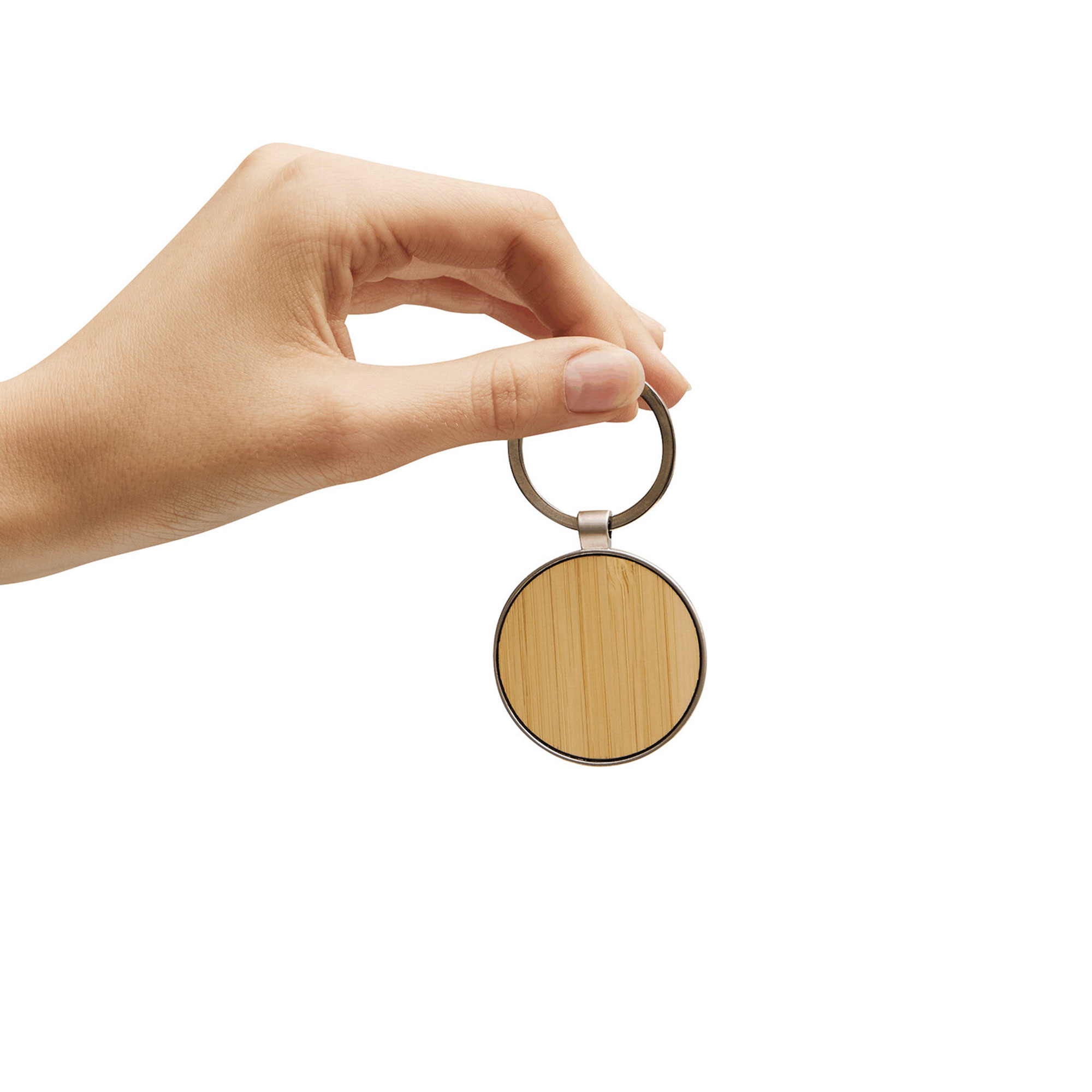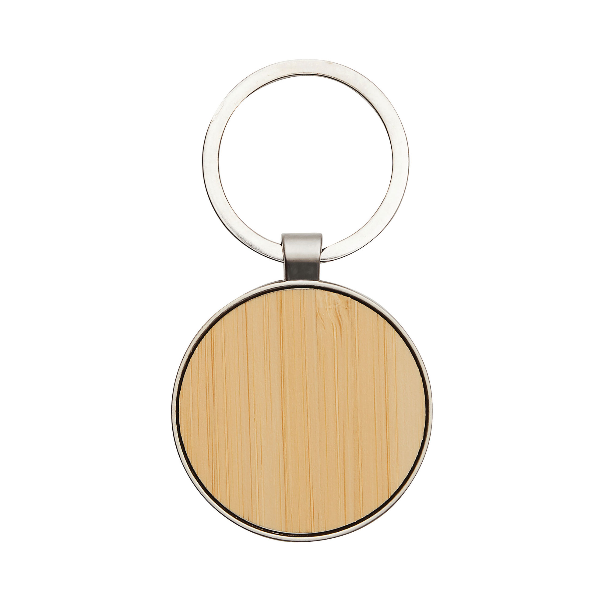 Lleva un toque rústico y clásico en tu bolsillo. Llavero con forma circular. Estructura metálica con aleación de zinc con acabado brillante y panel frontal de bambú barnizado. Medidas: 7,5 x 4 x 0,7 cm.