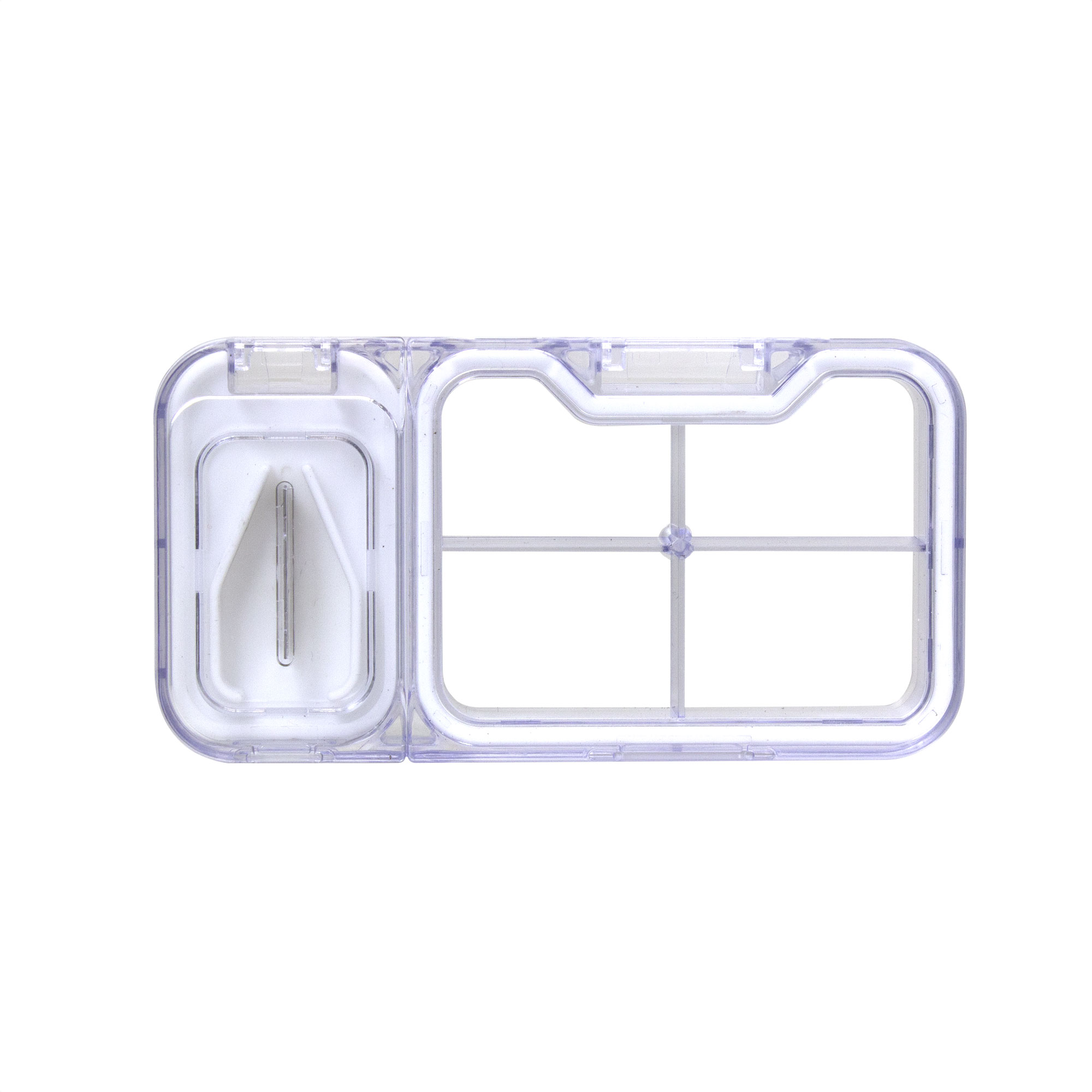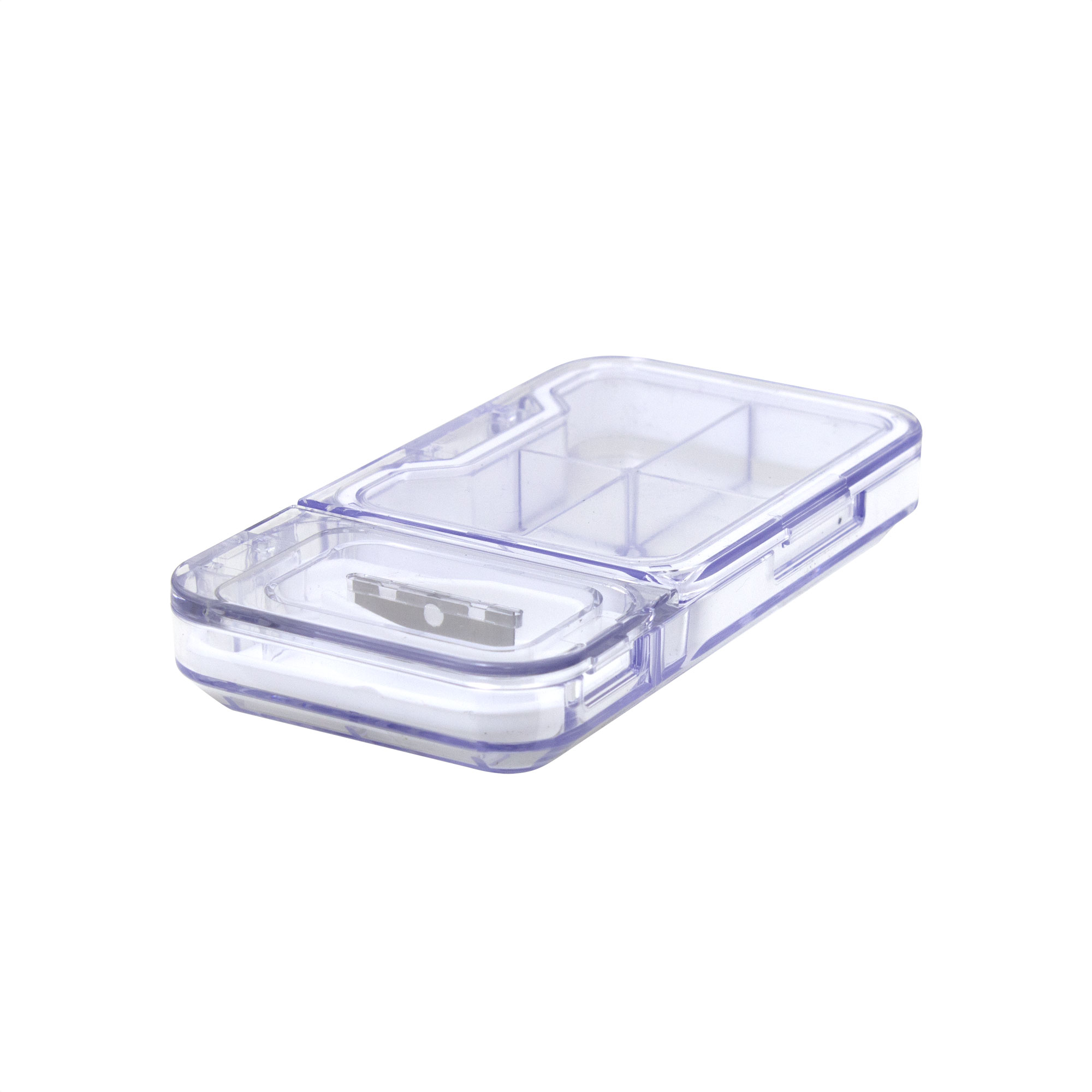 Compacto, práctico y seguro.Pastillero organizador corta pastilla. Compartimento principal con cuatro divisiones y recubrimiento perimetral de silicona. Compartimento secundario con base de silicona y soporte regulable de pastillas. Cuchilla de acero incorporada en la tapa. Ambos compartimentos con tapa rebatible y cierre a presión.Medidas: 12 x 6,3 x 1,8 cm