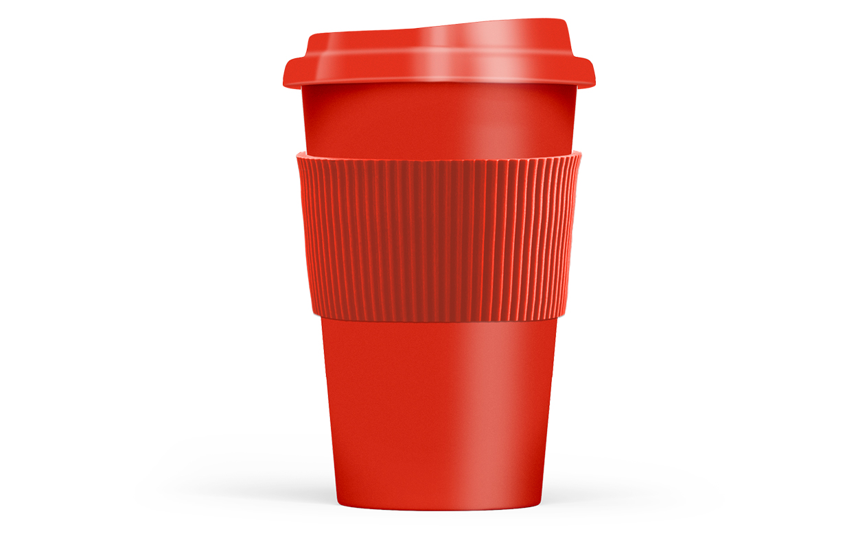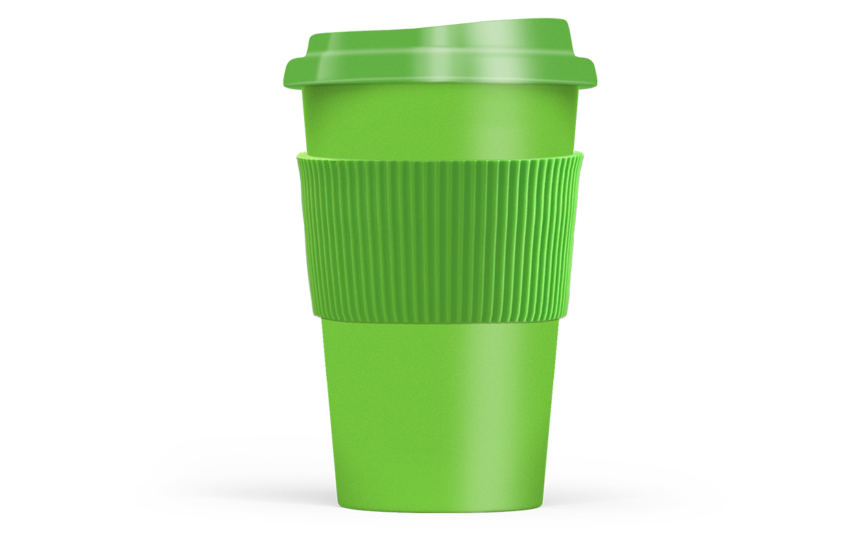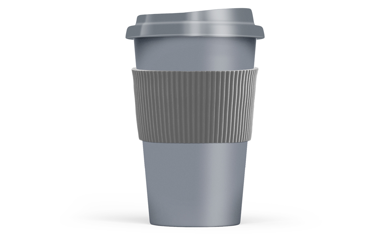 Vaso reutilizable fabricado en polipropileno con tapa de plástico duro y grip siliconado.