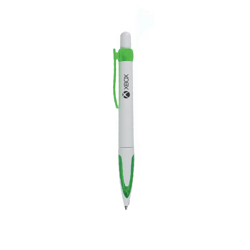 Bolígrafo plástico de cuerpo blanco con clip y grip en colores con transparencia. Apertura con pulsador.