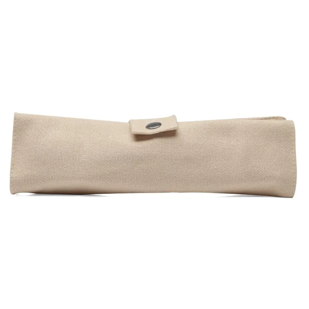 En estuche enrollable de lona de lino color crudo con separadores, elástico de sujeción y botón de cerrado a presión.