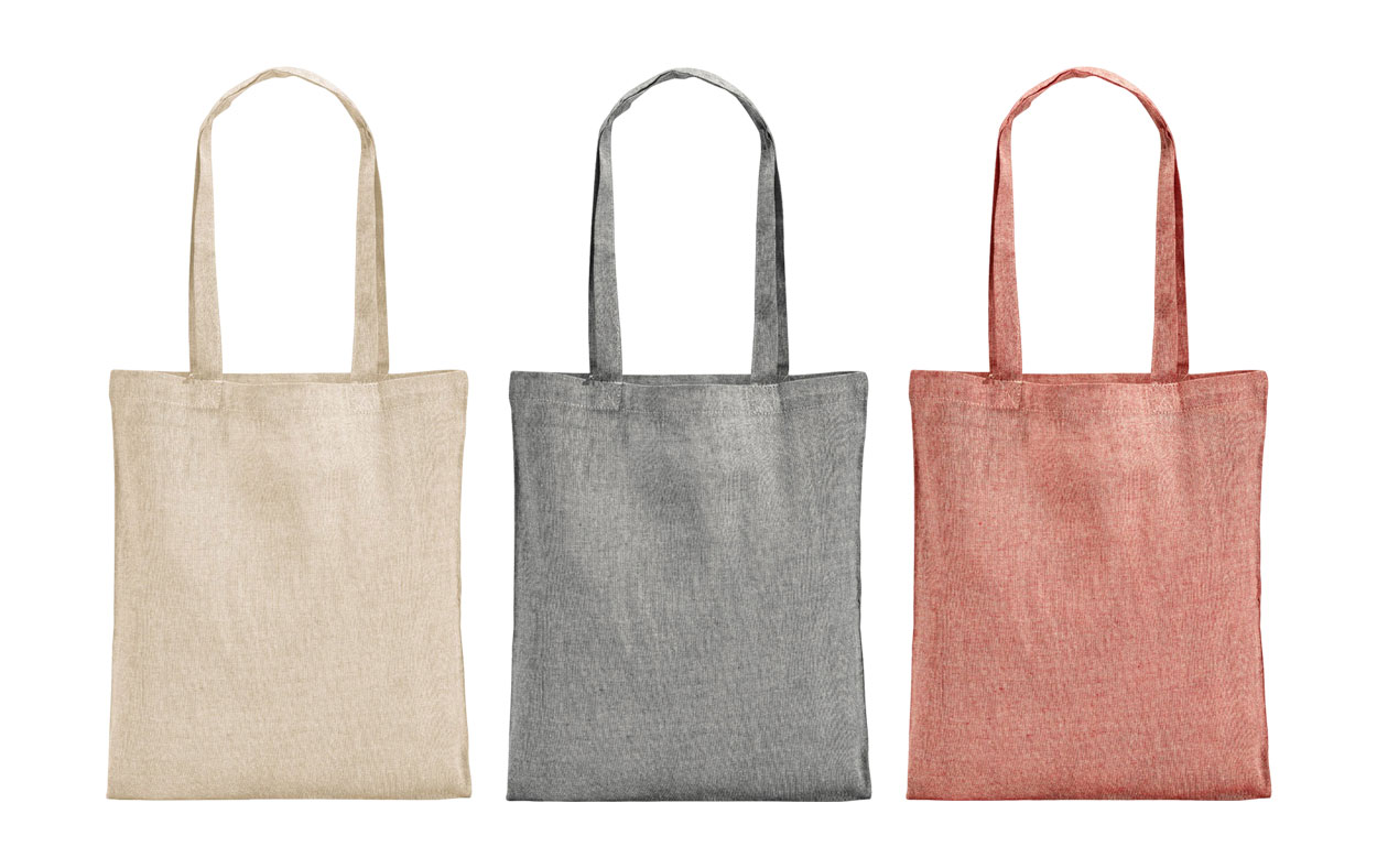 Bolsa fabricada con materiales reciclados: 70% algodón reciclado y 30% poliéster reciclado (rPET), con un gramaje de 140 g/m². Cuenta con asas de 60 cm de largo. El algodón reciclado conserva su color natural, ya que no se somete a procesos de teñido ni blanqueo, lo que reduce el uso de productos químicos y el impacto ambiental.