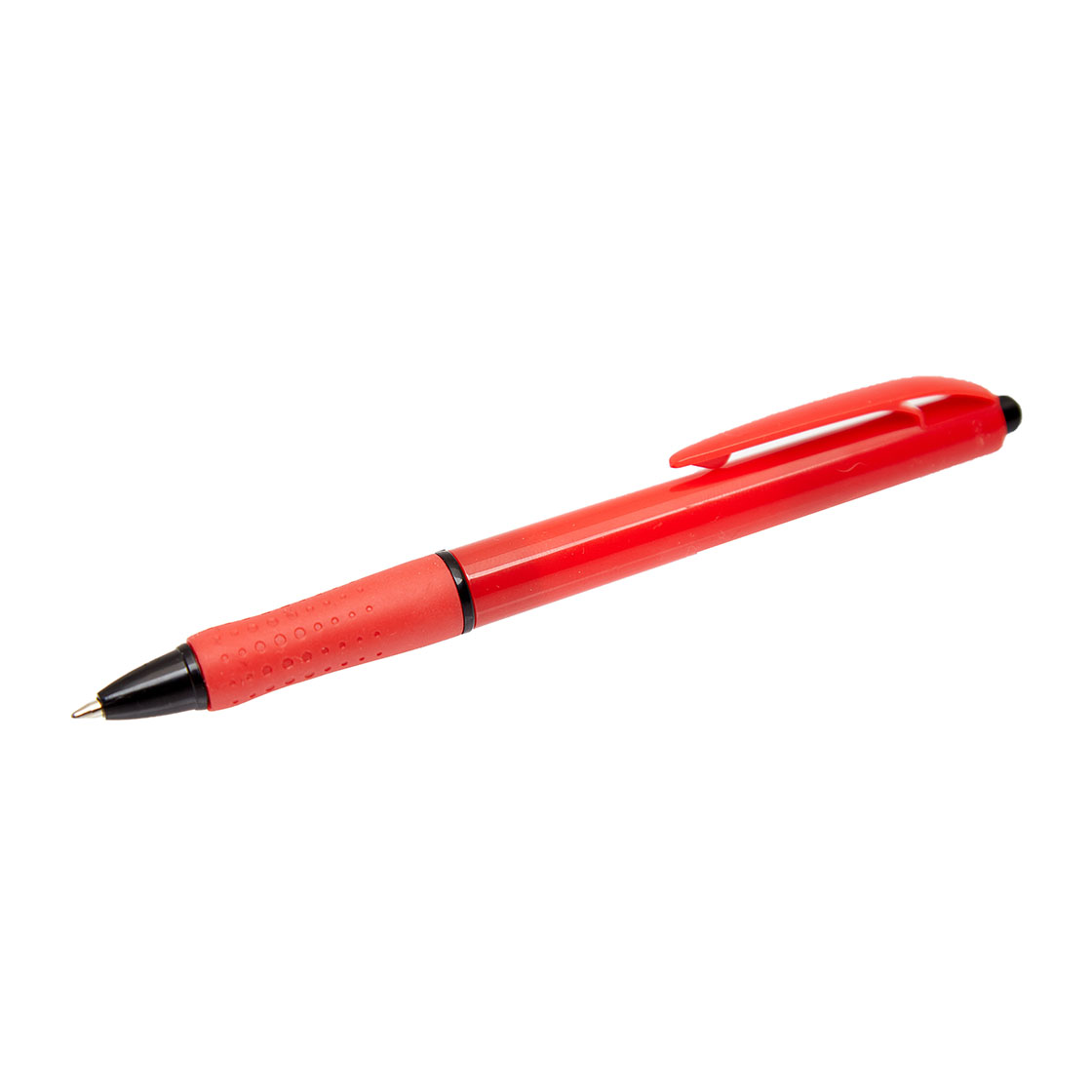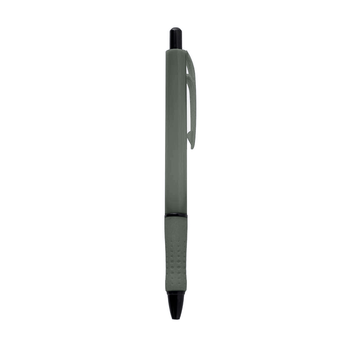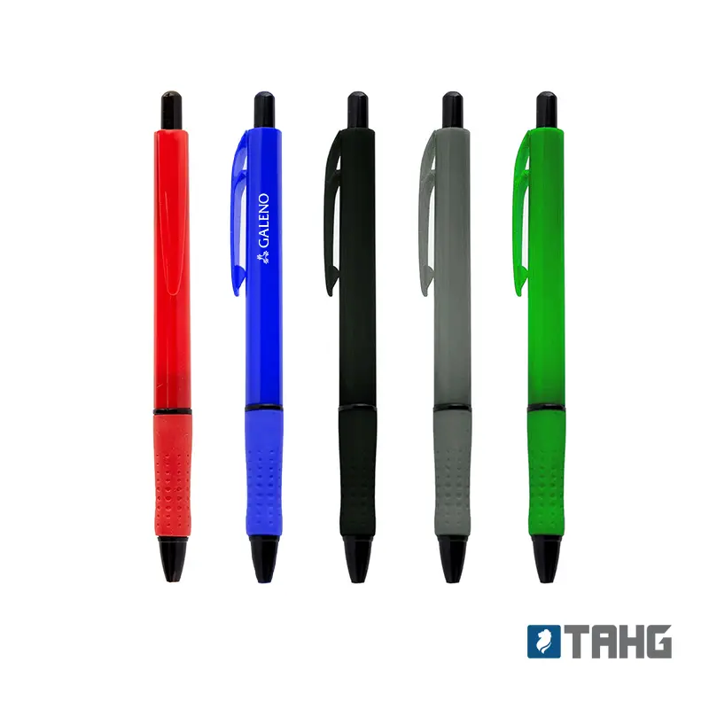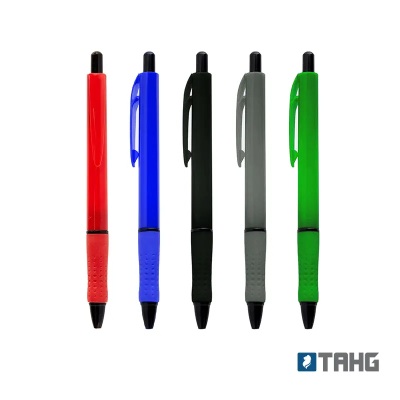 Bolígrafo con cuerpo plástico de color. Grip de goma combinado con el cuerpo. Pulsador negro. Retráctil. Tinta negra.