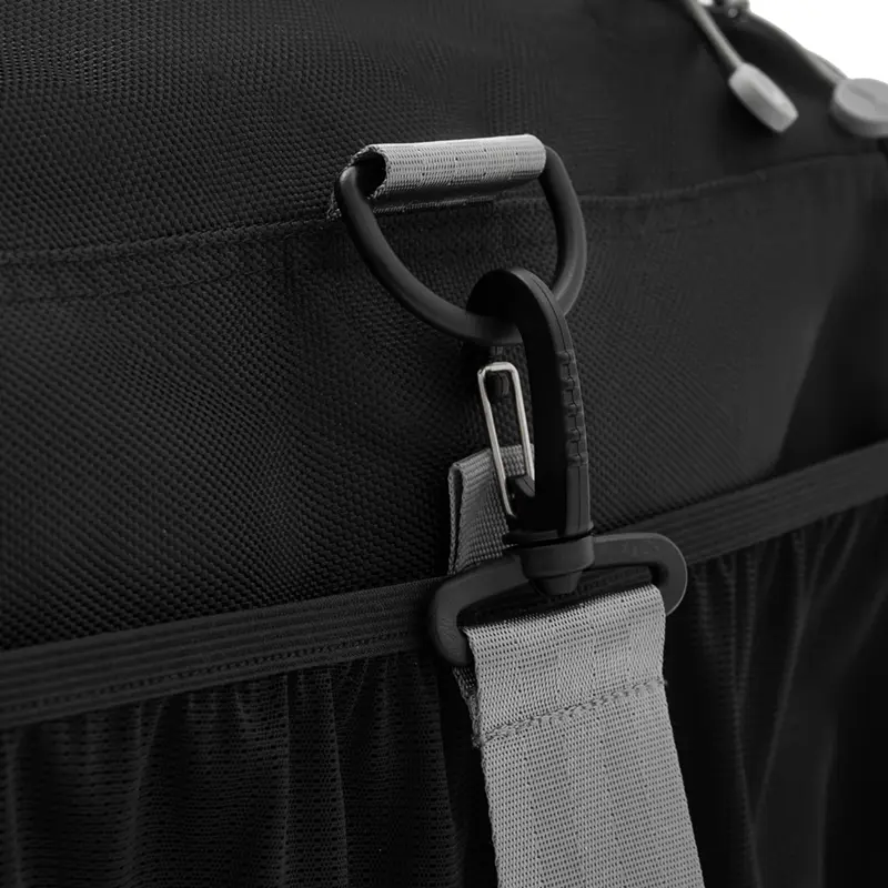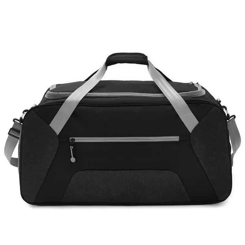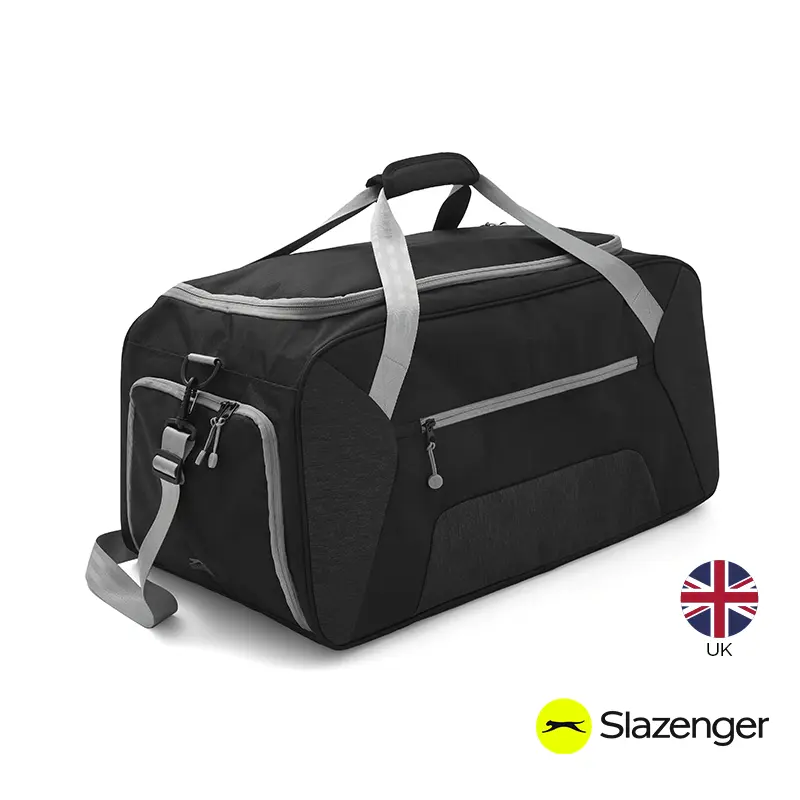 Bolso confeccionado en 168D nylon, ideal para tus actividades deportivas, viajes o giras de Rugby. Cuenta con un compartimiento principal amplio y un bolsillo frontal con cierre para objetos mas pequeños que necesites a mano. Además, tiene dos bolsillos laterales, uno de ellos con cierre, diseñado para guardar el calzado sin ensuciar le resto de tus pertenencias, y el otro, con red. Posee manijas y correa regulable, para llevarlo de la forma que te resulte más cómoda. Capacidad: 65L.