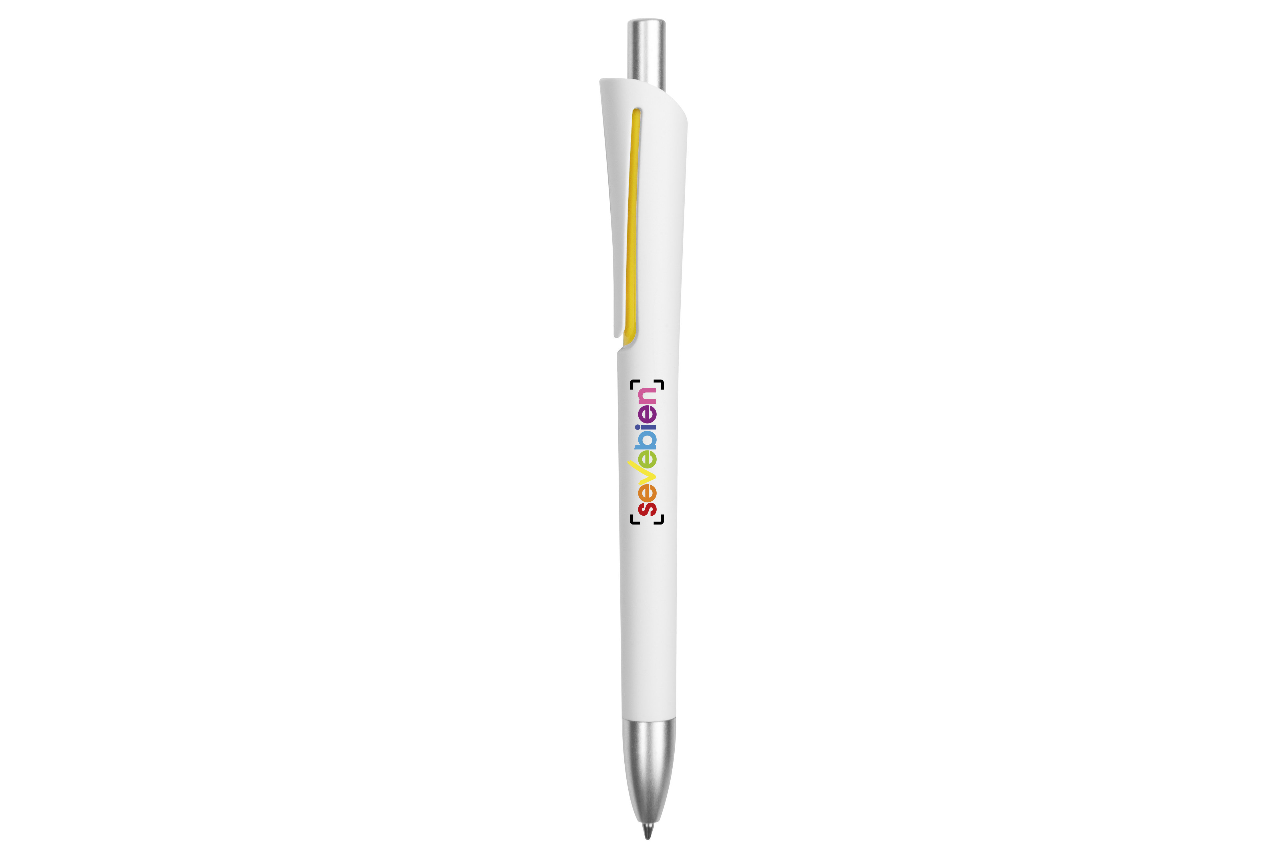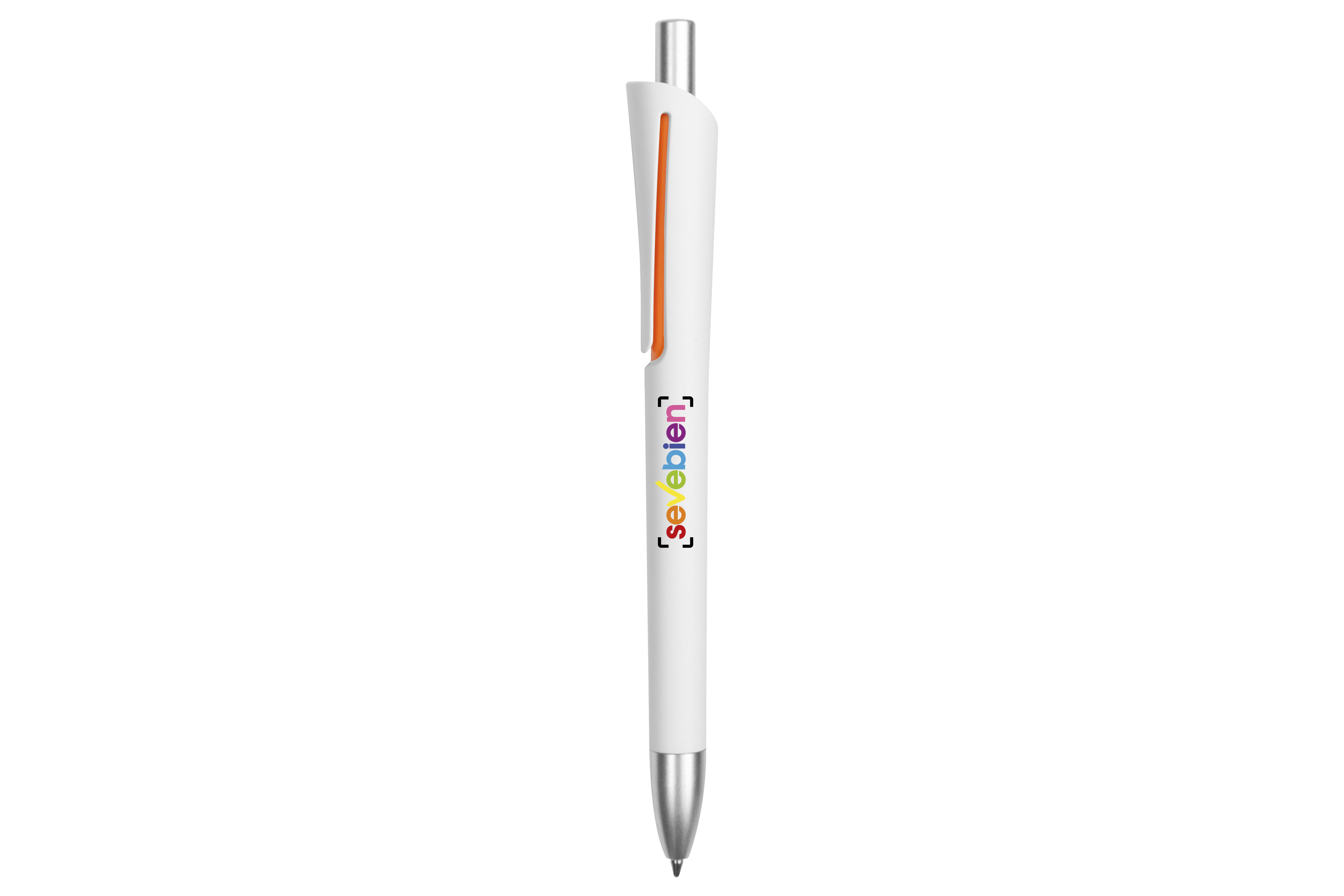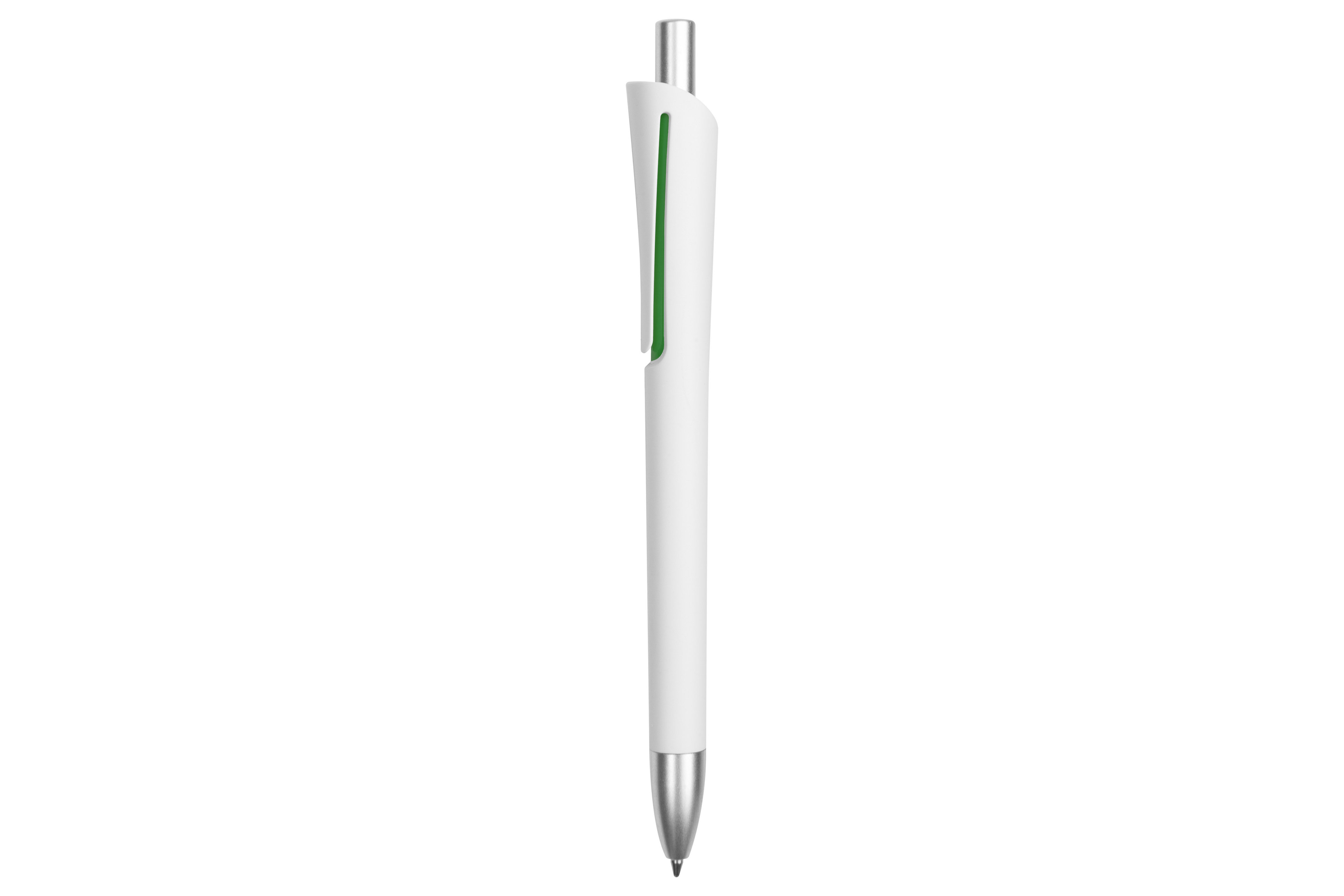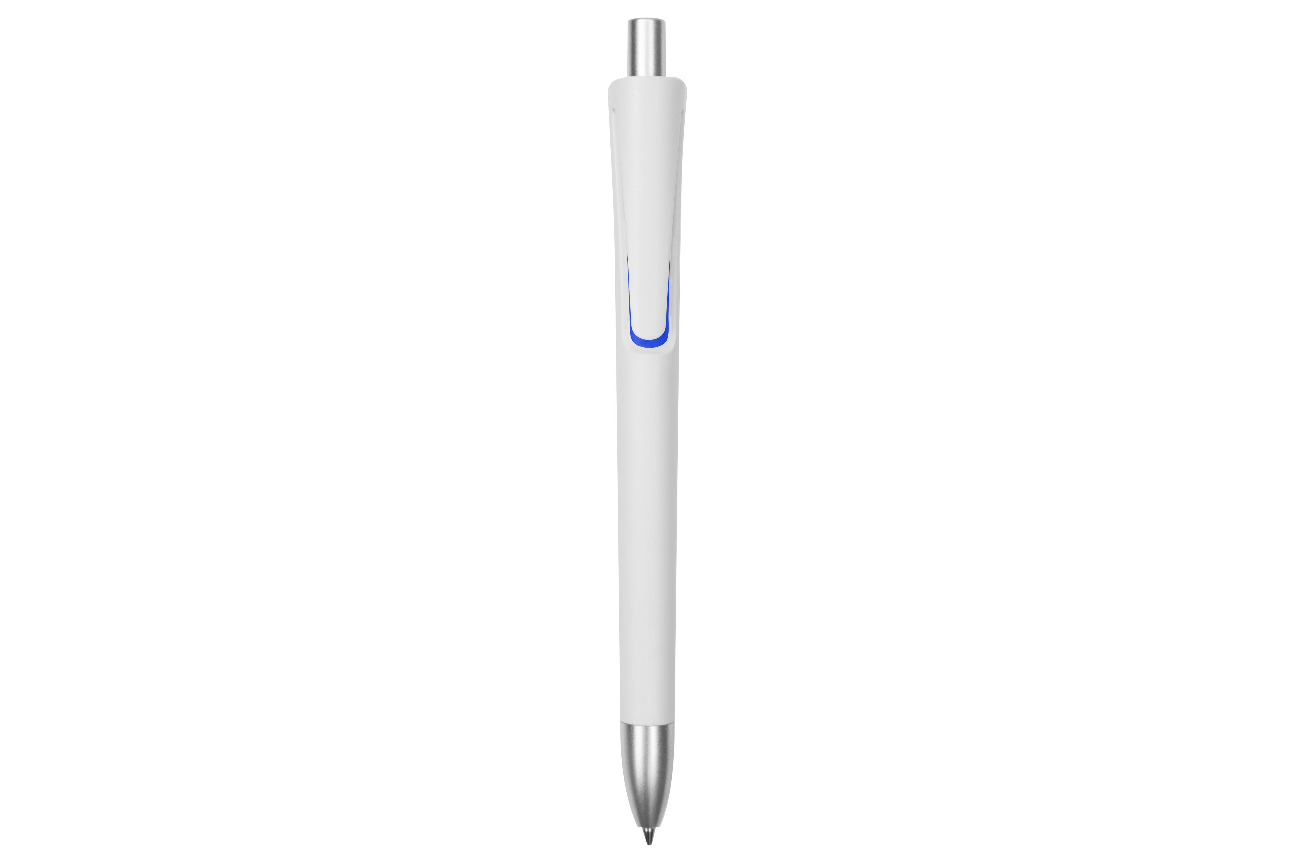 Plástico. Cuerpo blanco mate. Clip, puntera y pulsador color plata. Debajo del clip detalle de color. Tinta azul.