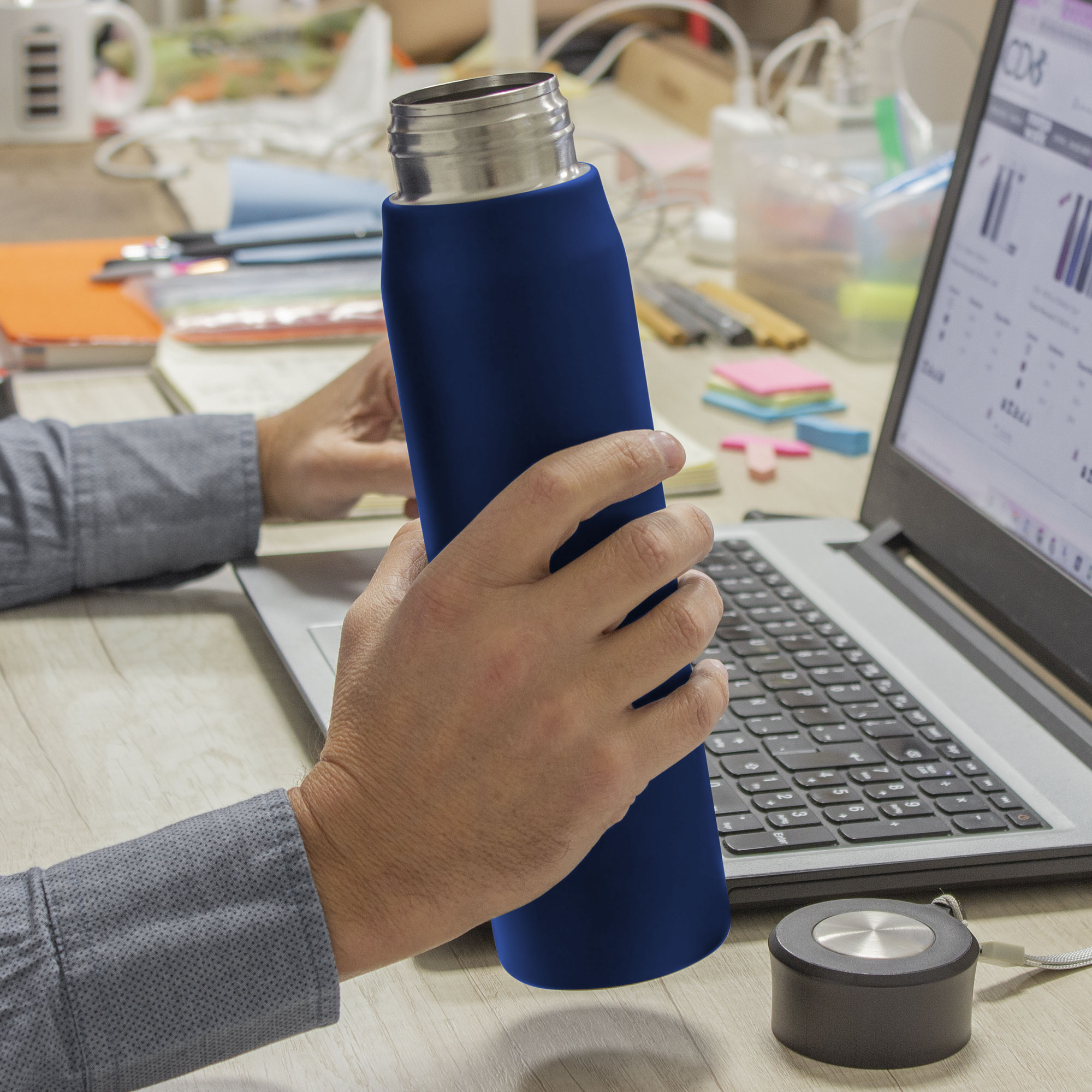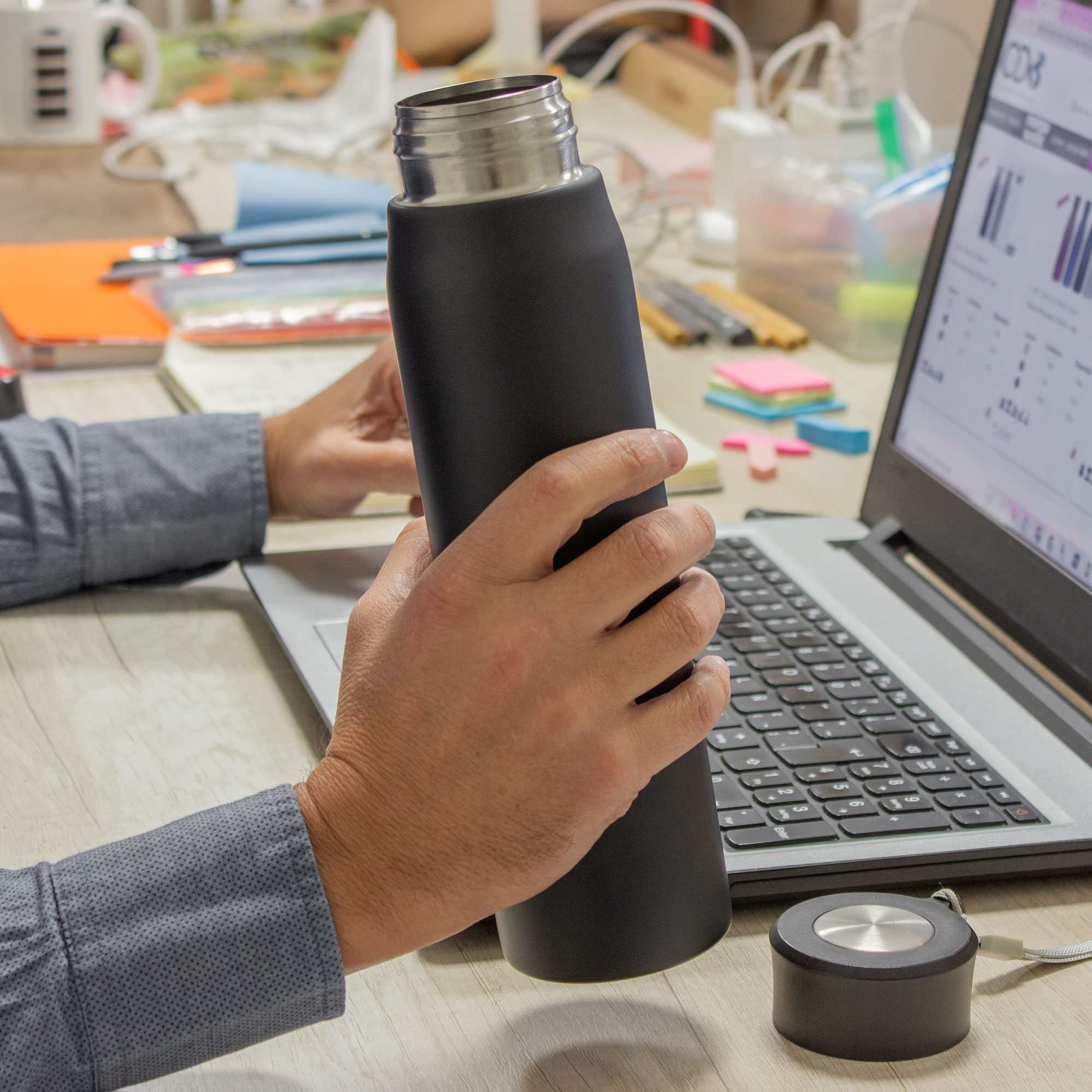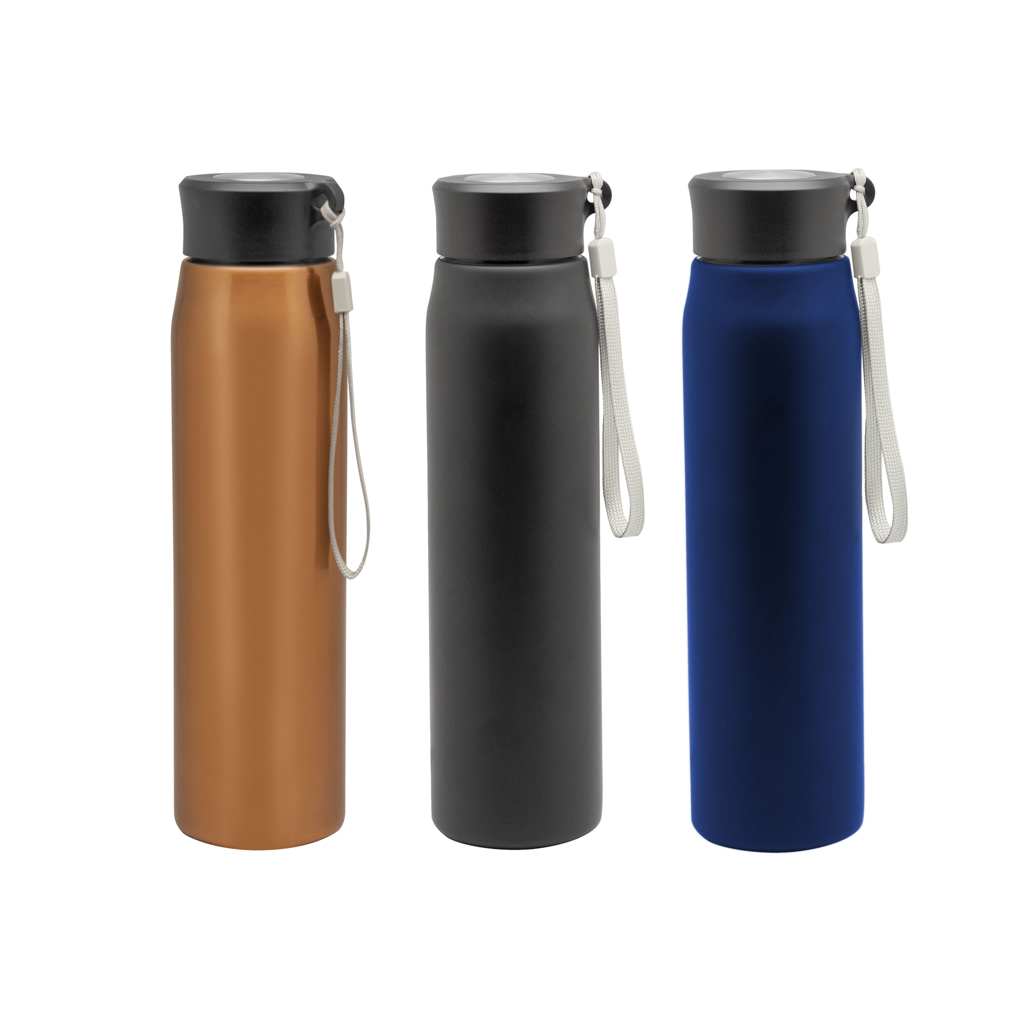 Ø 6,5 x 25 cm. Capacidad 800ml. Acero inoxidable. Botella de acero inoxidable 304. Tapa combinada en plástico y acero inoxidable 201 con tira de color gris de 12 cm de largo. Ideal para llevarla a todos lados. Presentación en caja de regalo.