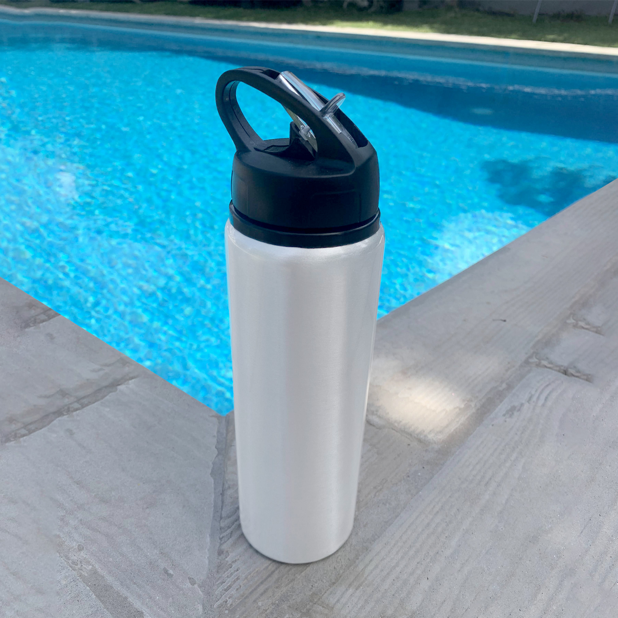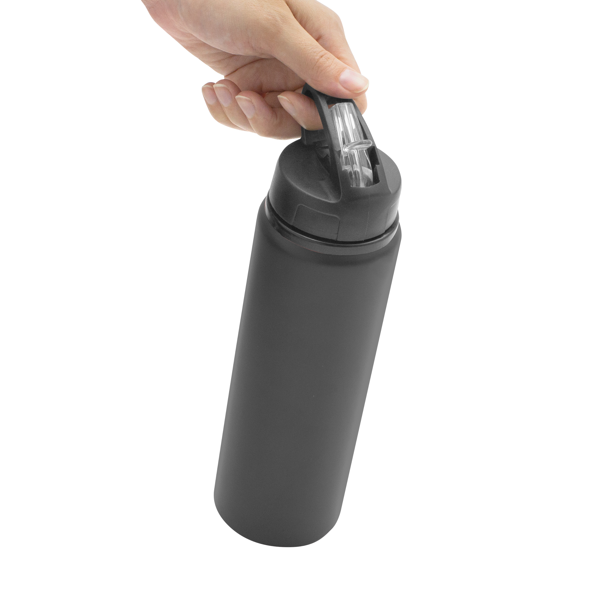 Clásica e Ideal para cualquier ocasión.Botella de aluminio con manija de agarre en la tapa, sorbete plástico y boquilla rebatible. Tapa a rosca de plástico. Medidas: Ø 7 x 25 cm.