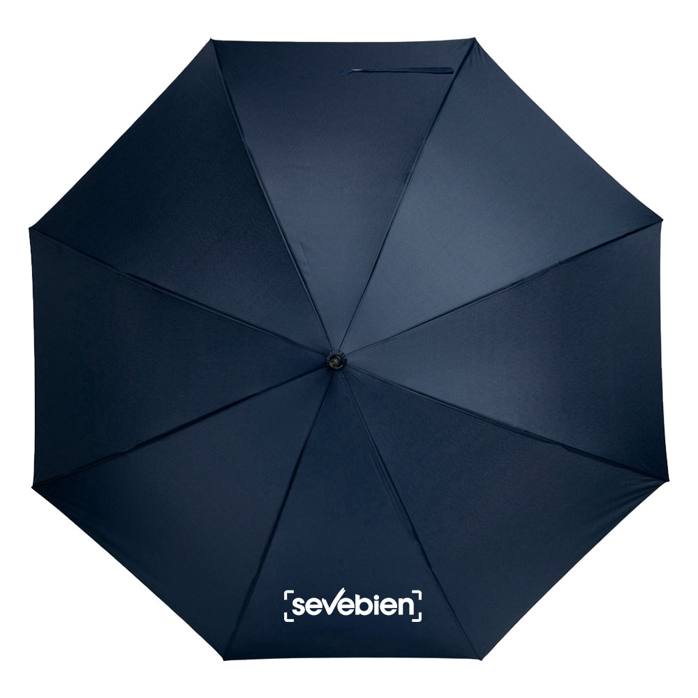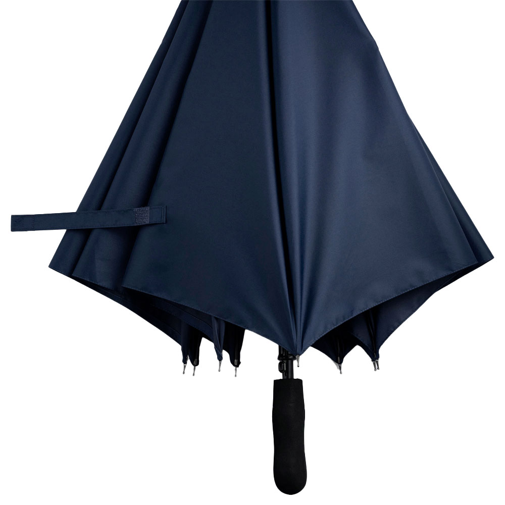 Ø 120 cm. 8 gajos. Ancho gajo 45 cm. Largo total 93 cm. Poliéster pongee, metal y EVA. Paraguas APERTURA AUTOMÁTICA Y CIERRE MANUAL. Eje metálico, varillas en fibra de vidrio , punta niquelada, mango en EVA. Botón a presión. Cierre con correa de velcro.