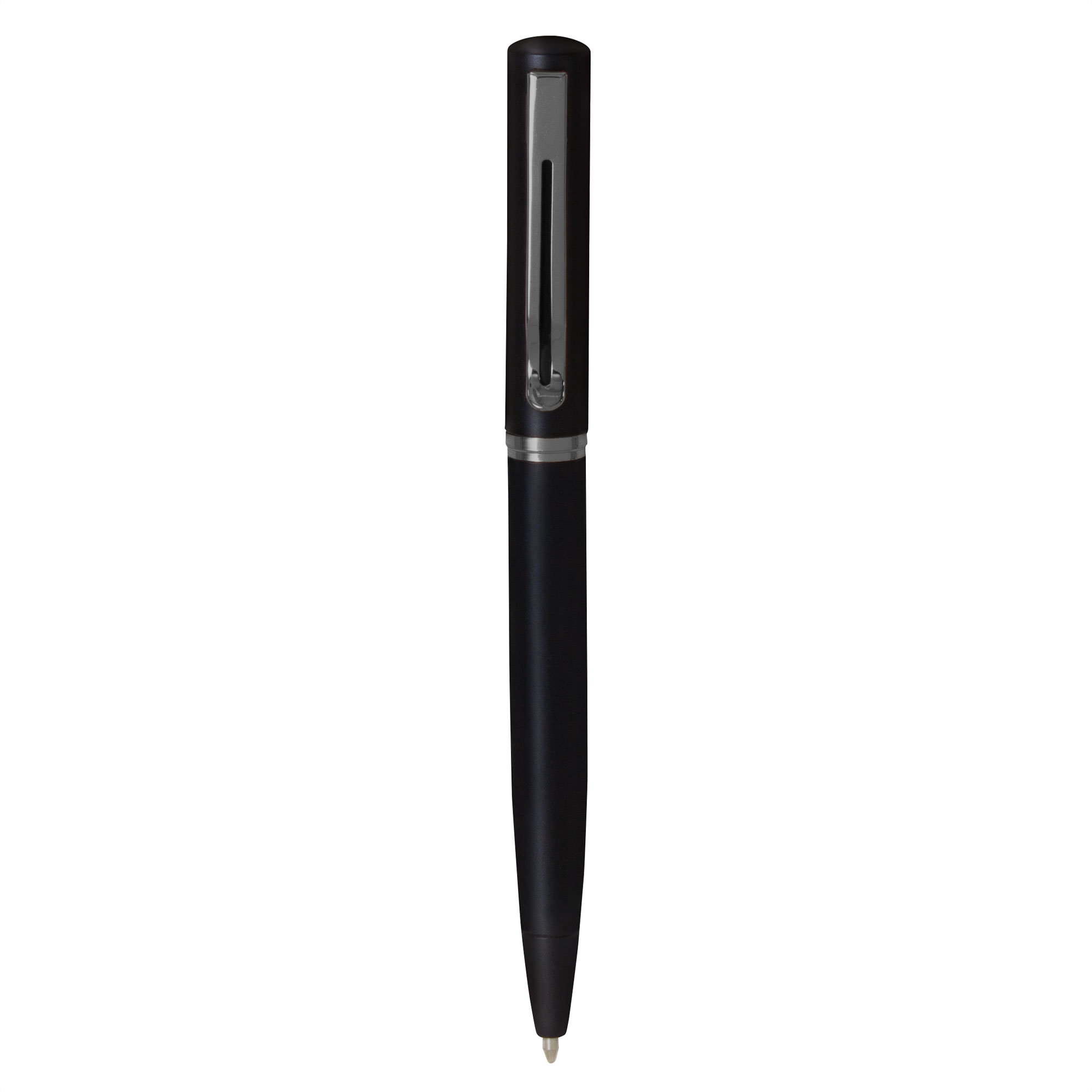 Estilo moderno.Bolígrafo con apertura giratoria. Cuerpo metálico en negro mate. Parte superior de hierro y parte inferior de acero inoxidable. Destape electroplateado en la parte superior. Recarga Parker metálico. Clip y anillos metálicos color gun.