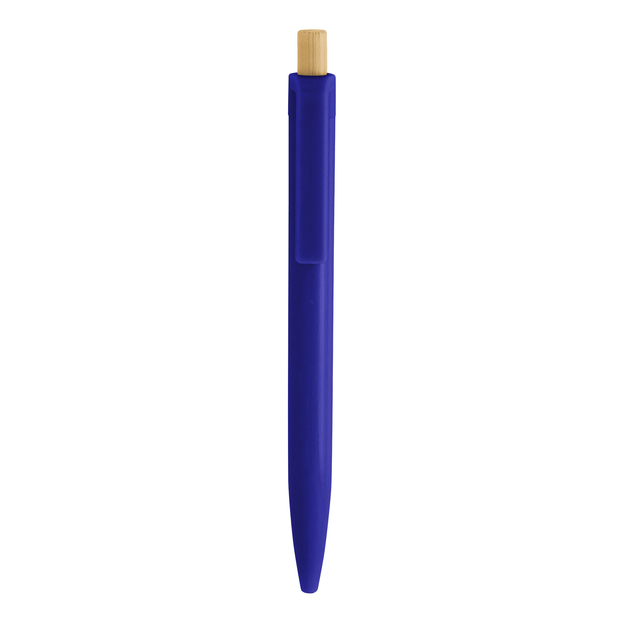 Diseño moderno con materiales reciclados.Bolígrafo retráctil. Cuerpo plástico en diferentes colores acabado brillante. Pulsador de bambú. Medidas: 1,05 x 13,5 cm.