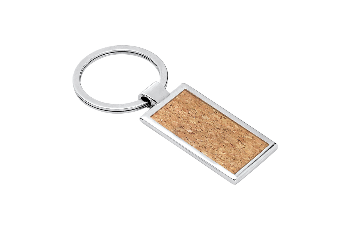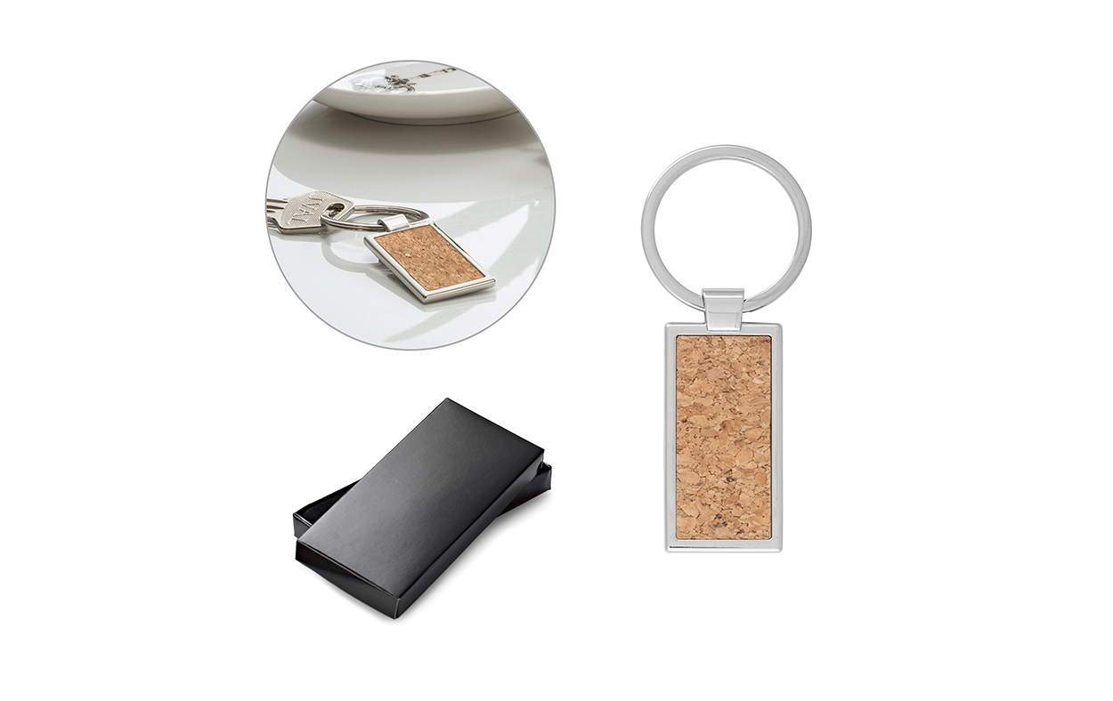 Llavero de corcho y metal. Suministrado en caja de presentación.