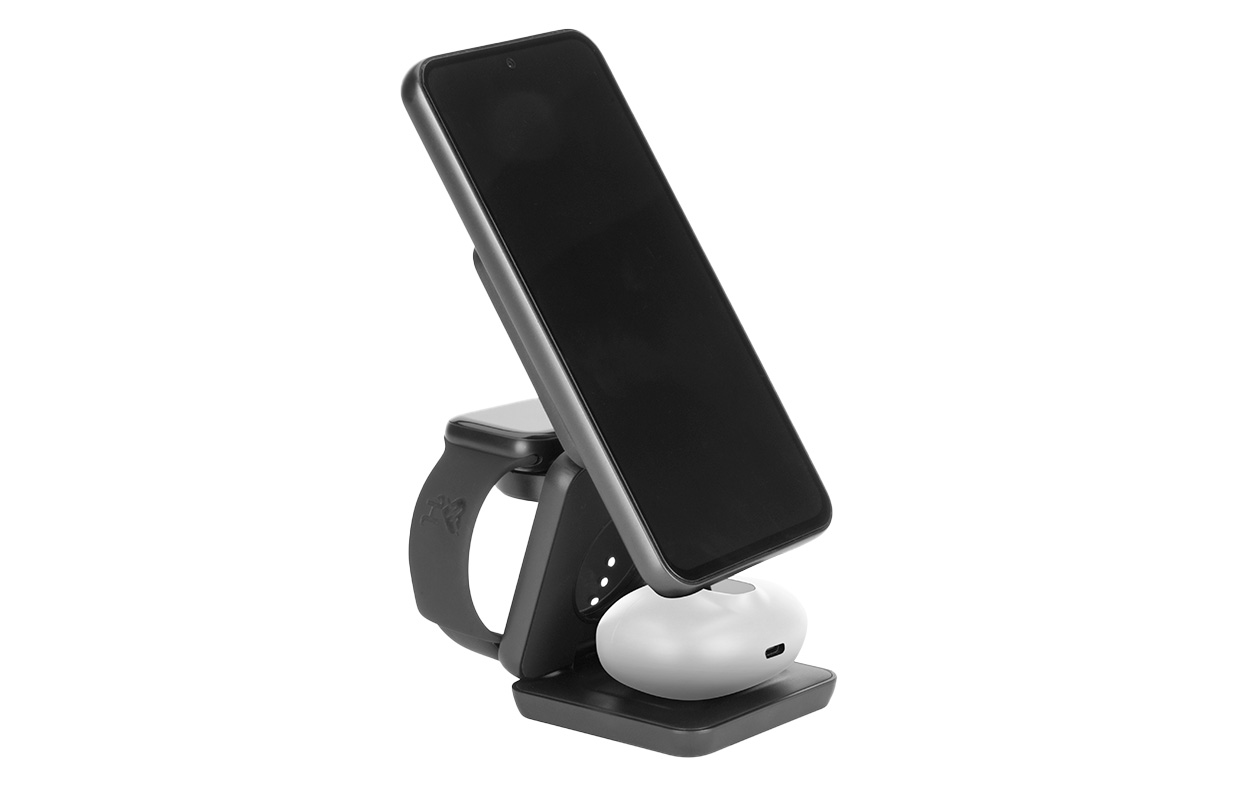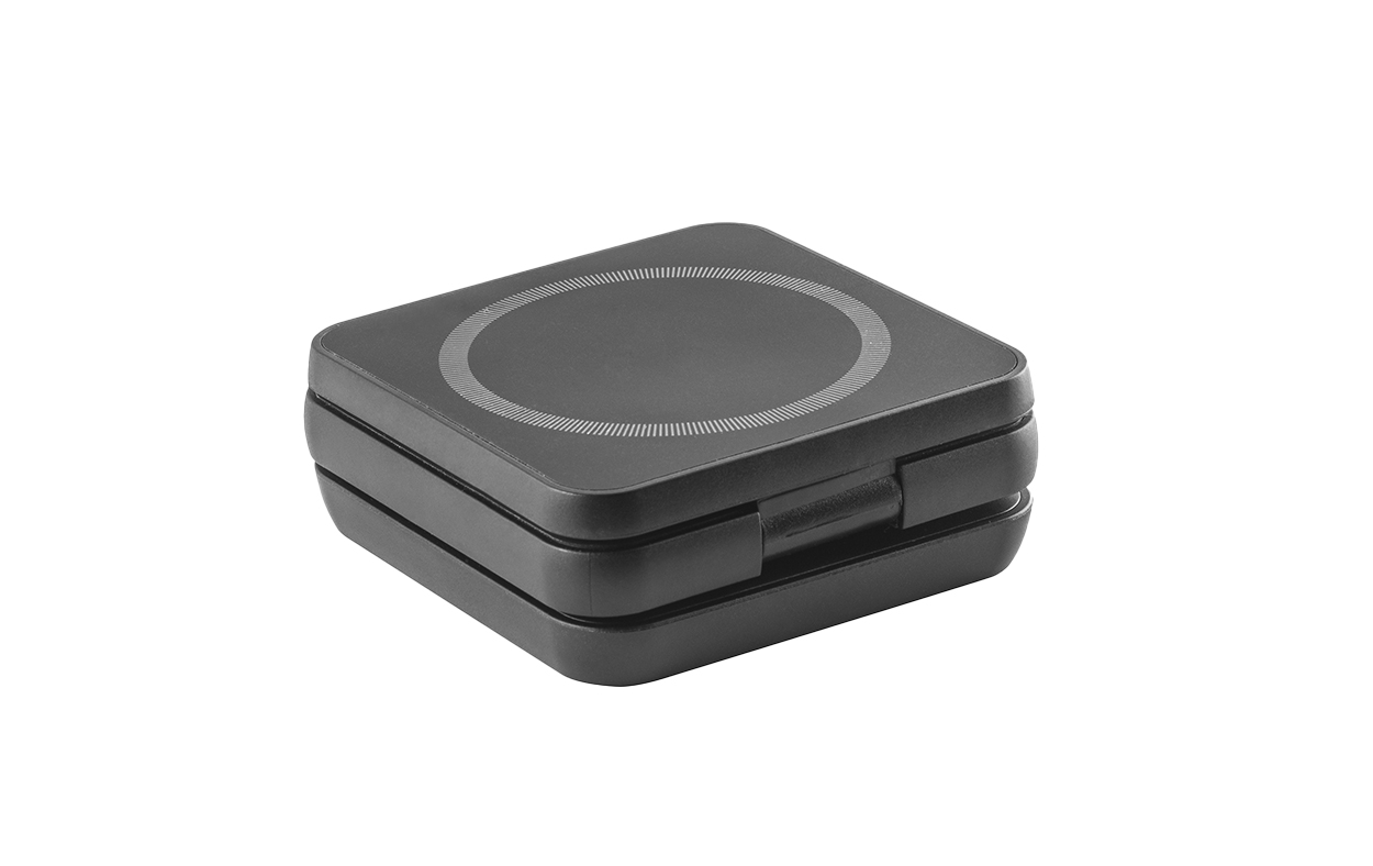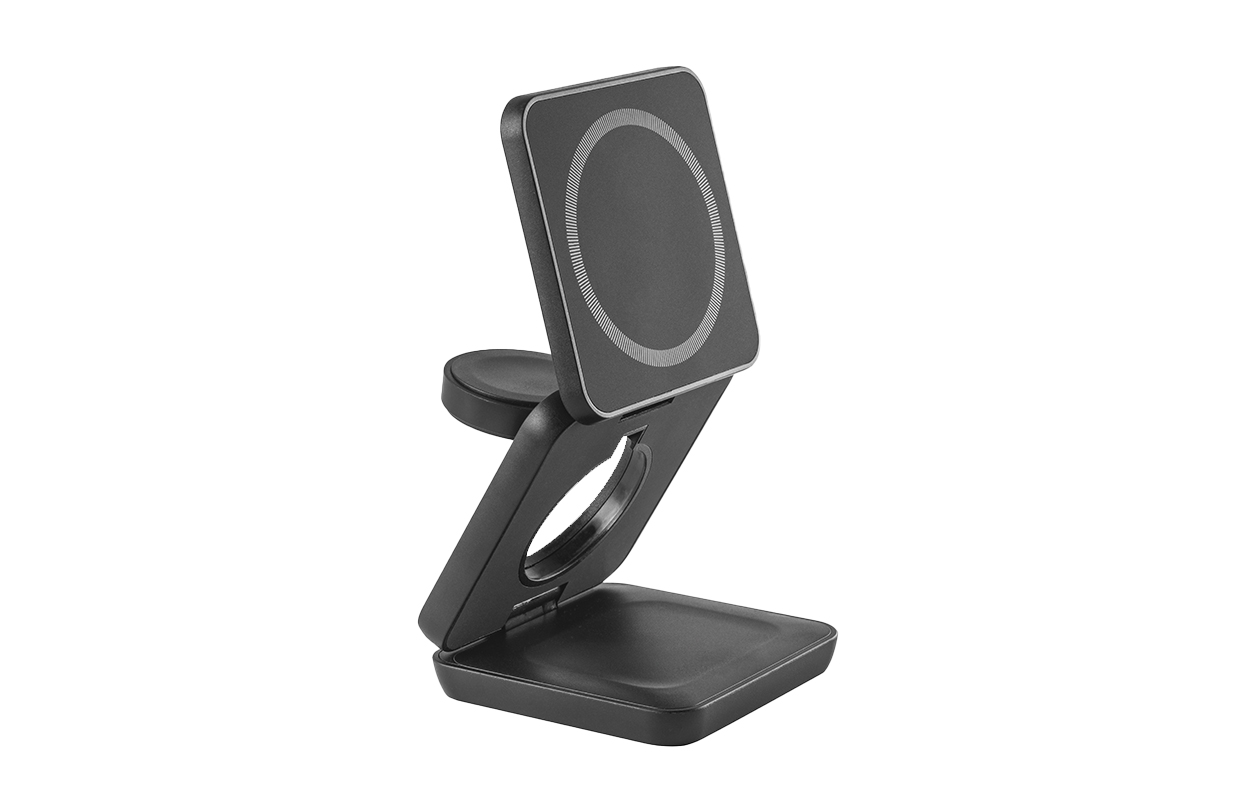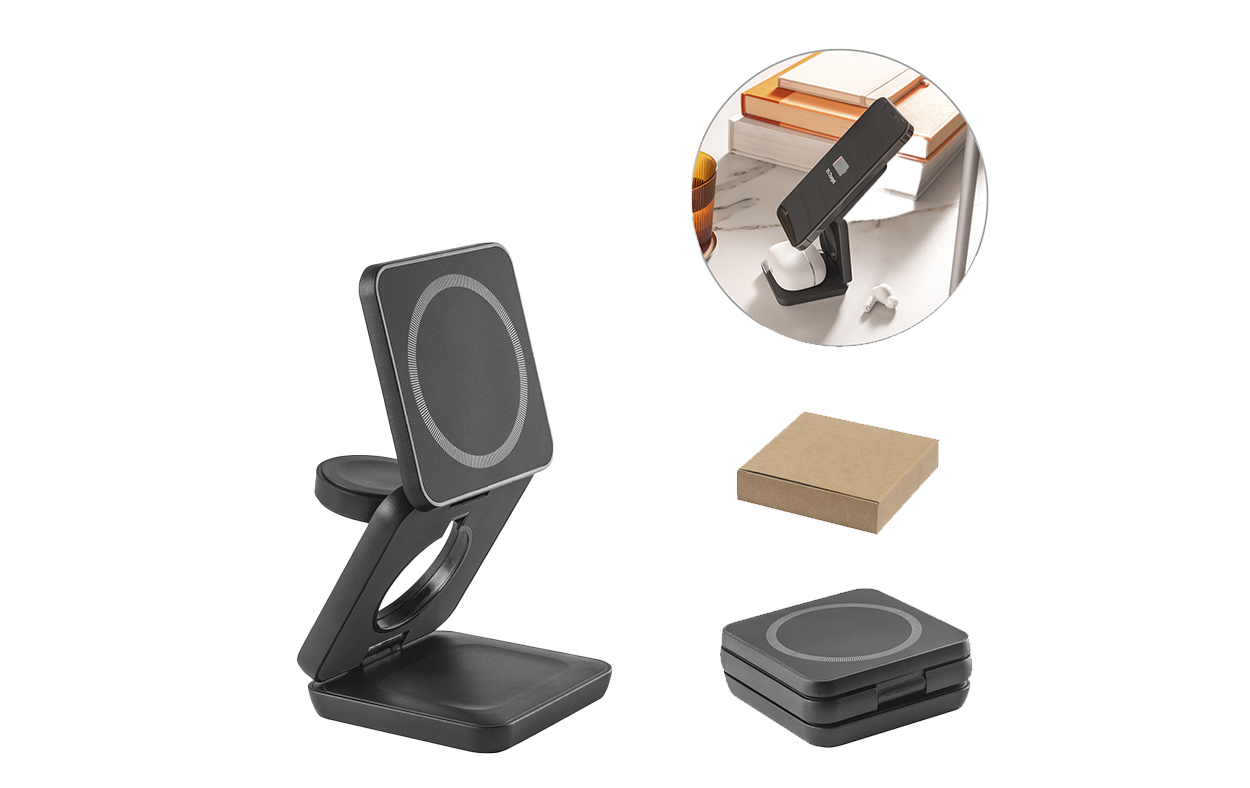 Cargador inalámbrico magnético plegable ultrarrápido elaborado en ABS reciclado. Permite cargar hasta 3 dispositivos inalámbricos en simultáneo: 1) smartphone de 15W, 2) auriculares de 5W y 3) smartwatch de 2,5W. Incluye packaging: caja de papel kraft de 11 x 9 x 3,6 cm.Gracias a su capacidad magnética y carga inalámbrica, es fácil sujetar el smartphone al soporte mientras se carga. Para smartphones que no tengan la función magnética, contiene un anillo magnético extra.Ideal para usar tanto en la oficina como de viaje, al ser portátil.Compatible con dispositivos móviles con tecnología de carga inalámbrica. Incluye cable USB-C.