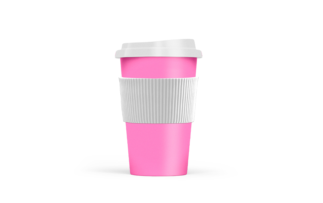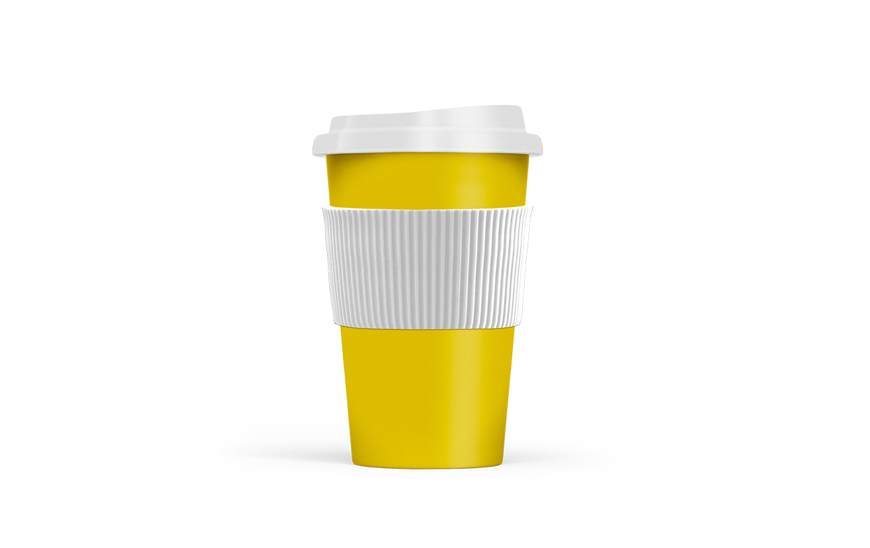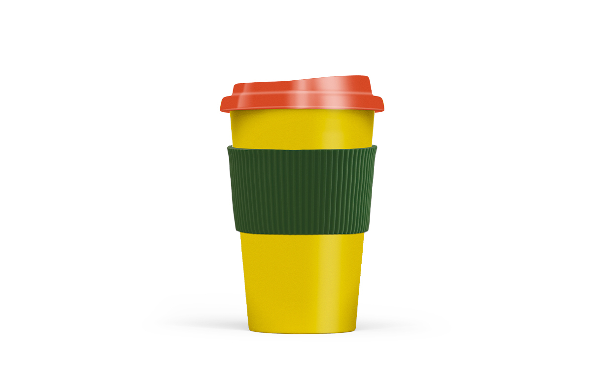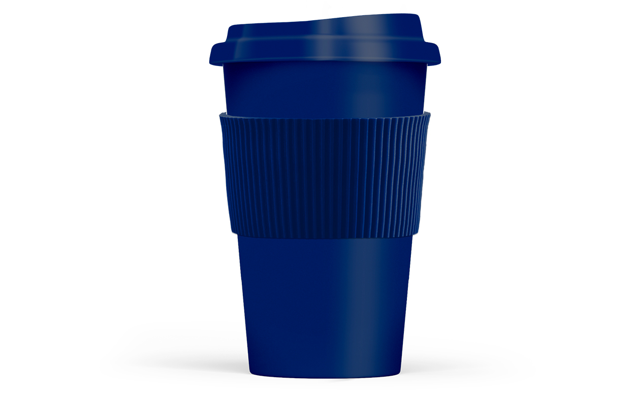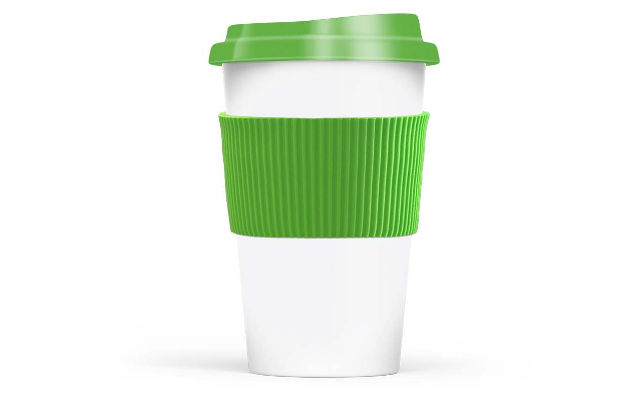 Vaso reutilizable fabricado en polipropileno con tapa de plástico duro y grip siliconado.