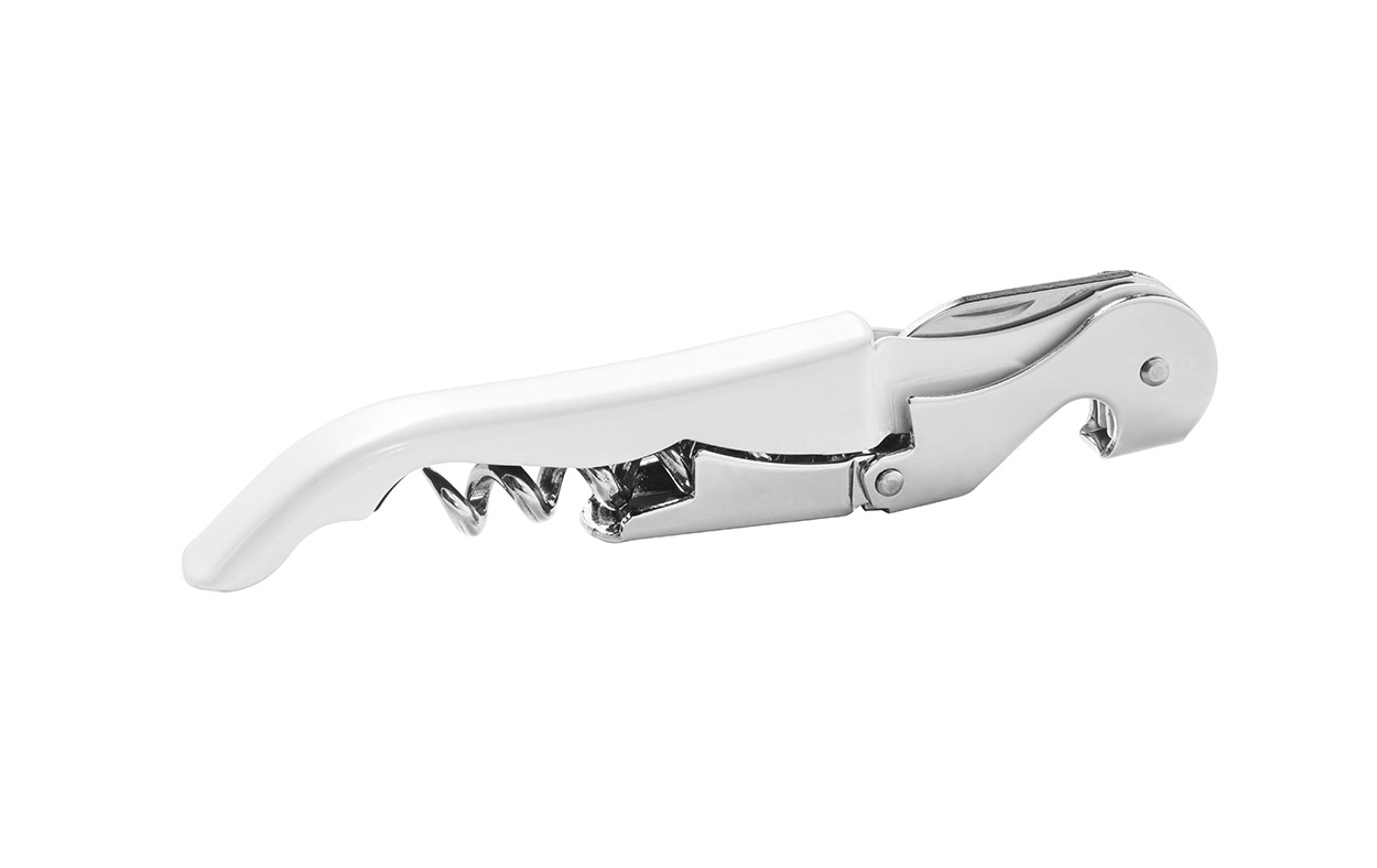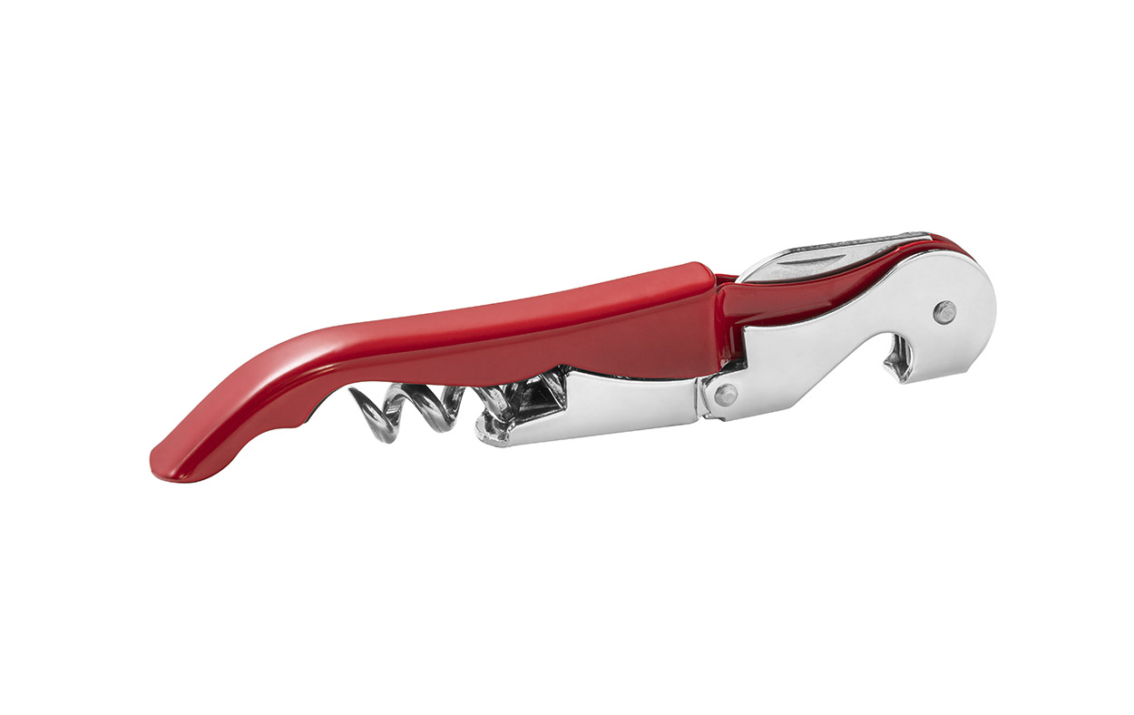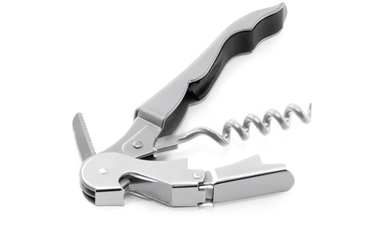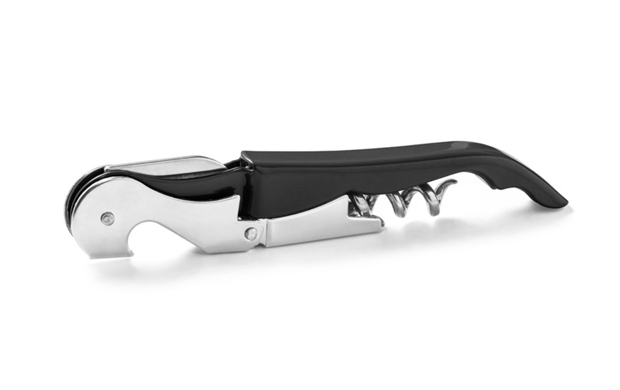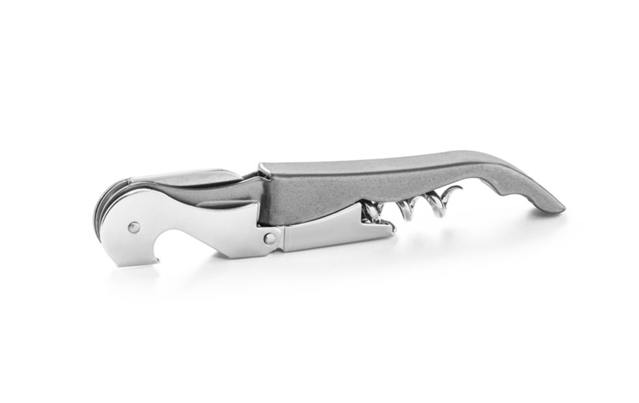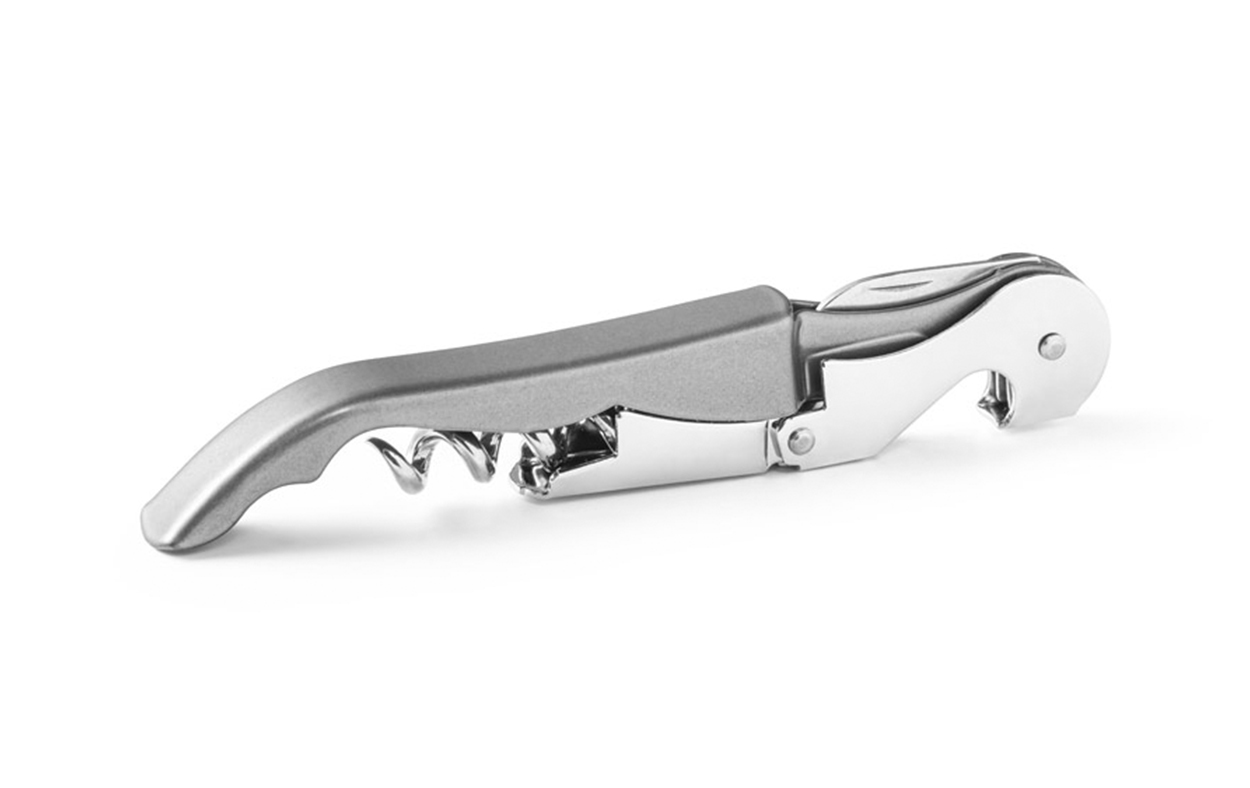 Sacacorchos 2 tiempos de metal que incluye destapador, navaja de sommelier y espiral en acero inoxidable. Medidas: 12,1 x 2 x 1,2 cm