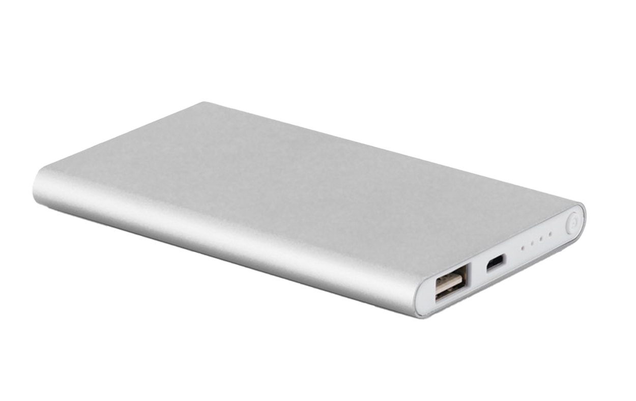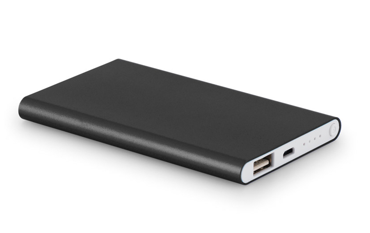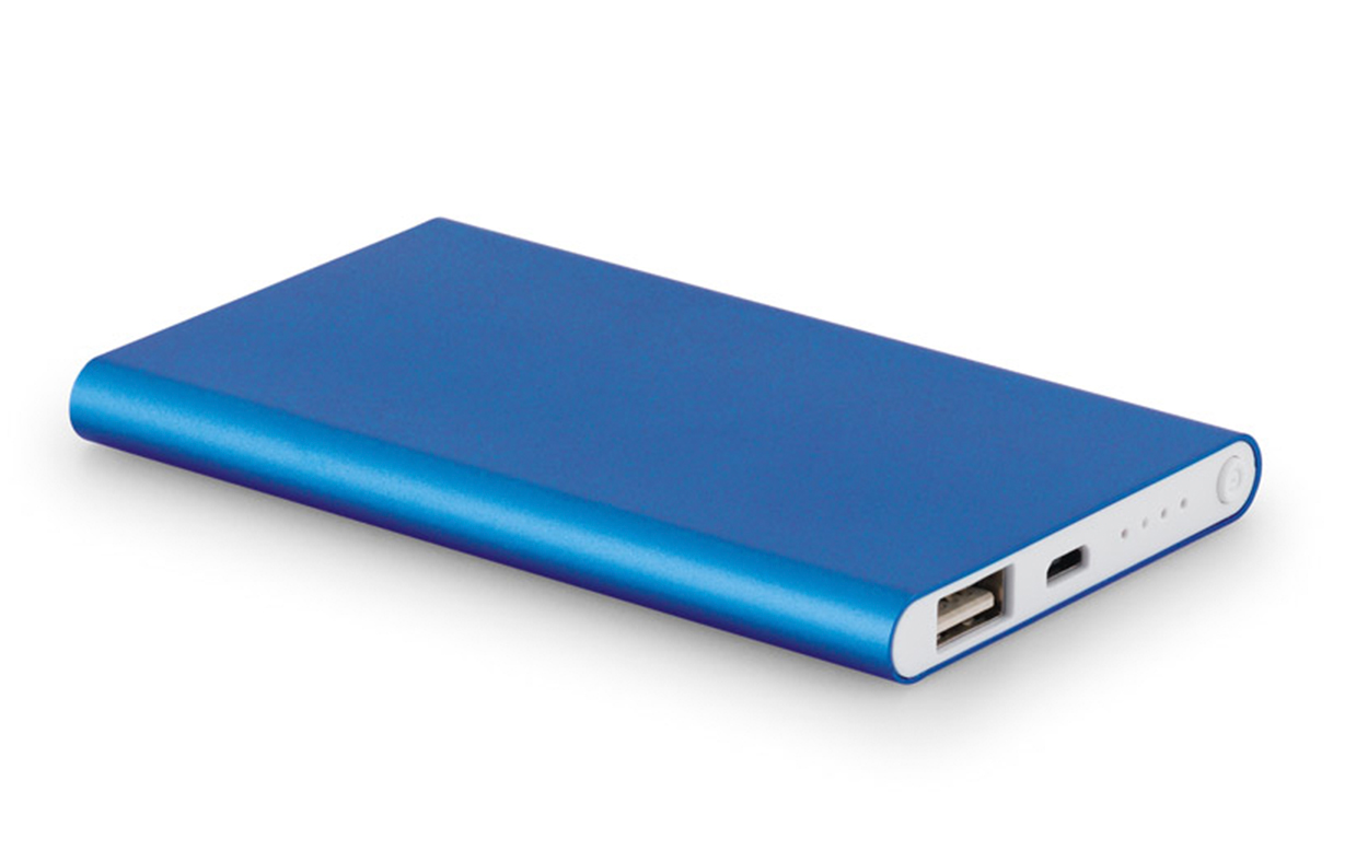 Power Bank de aluminio con batería de polímero de litio. Cuenta con una capacidad de 4000 mAh y una vida útil de mas de 500 ciclos. Tiene una entrada de 5V/1A, salida de 5V/1A y LED con indicador de carga. Dispone de 2 puertos para poder cargar mas de un celular. Incluye un cable USB/USB-C para cargar la batería y es suministrado en una caja de regalo.