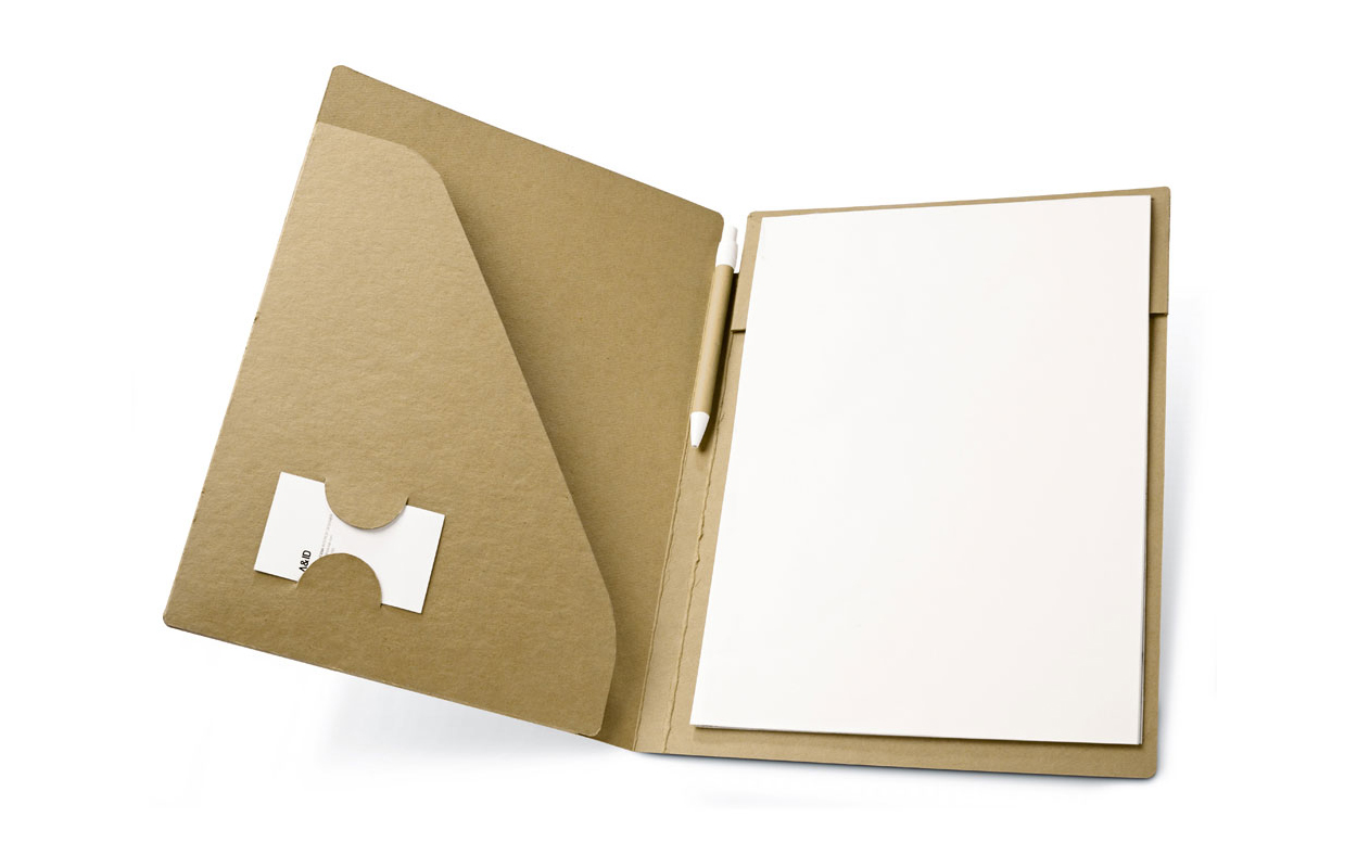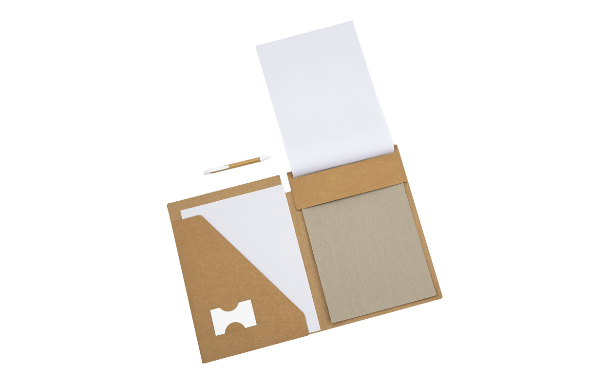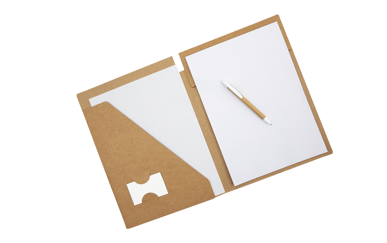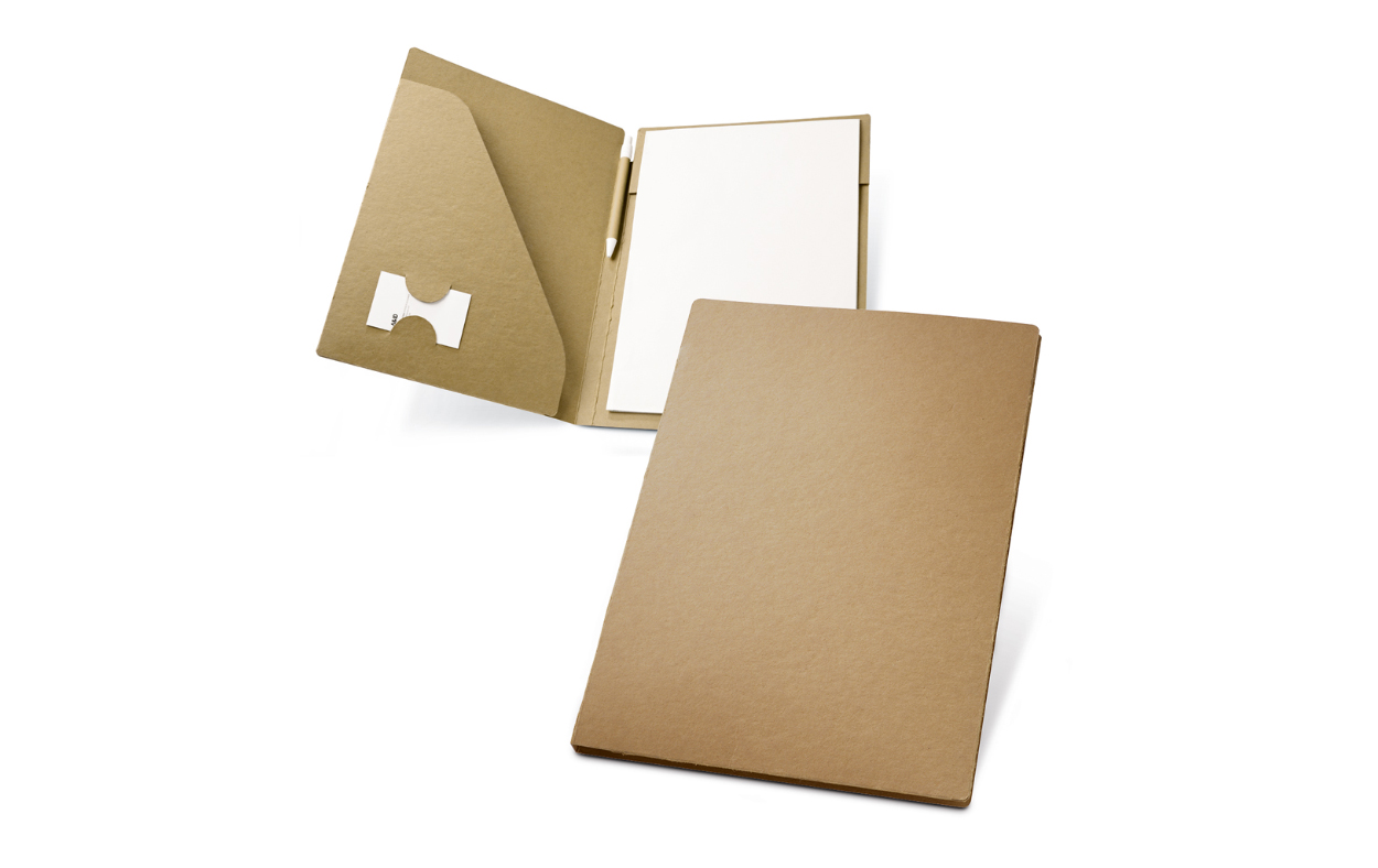 Portafolios A4 de Cartón (450 g/m²). Incluye Bloc de 20 hojas lisas en papel reciclado y Bolígrafo de tinta azul incluido