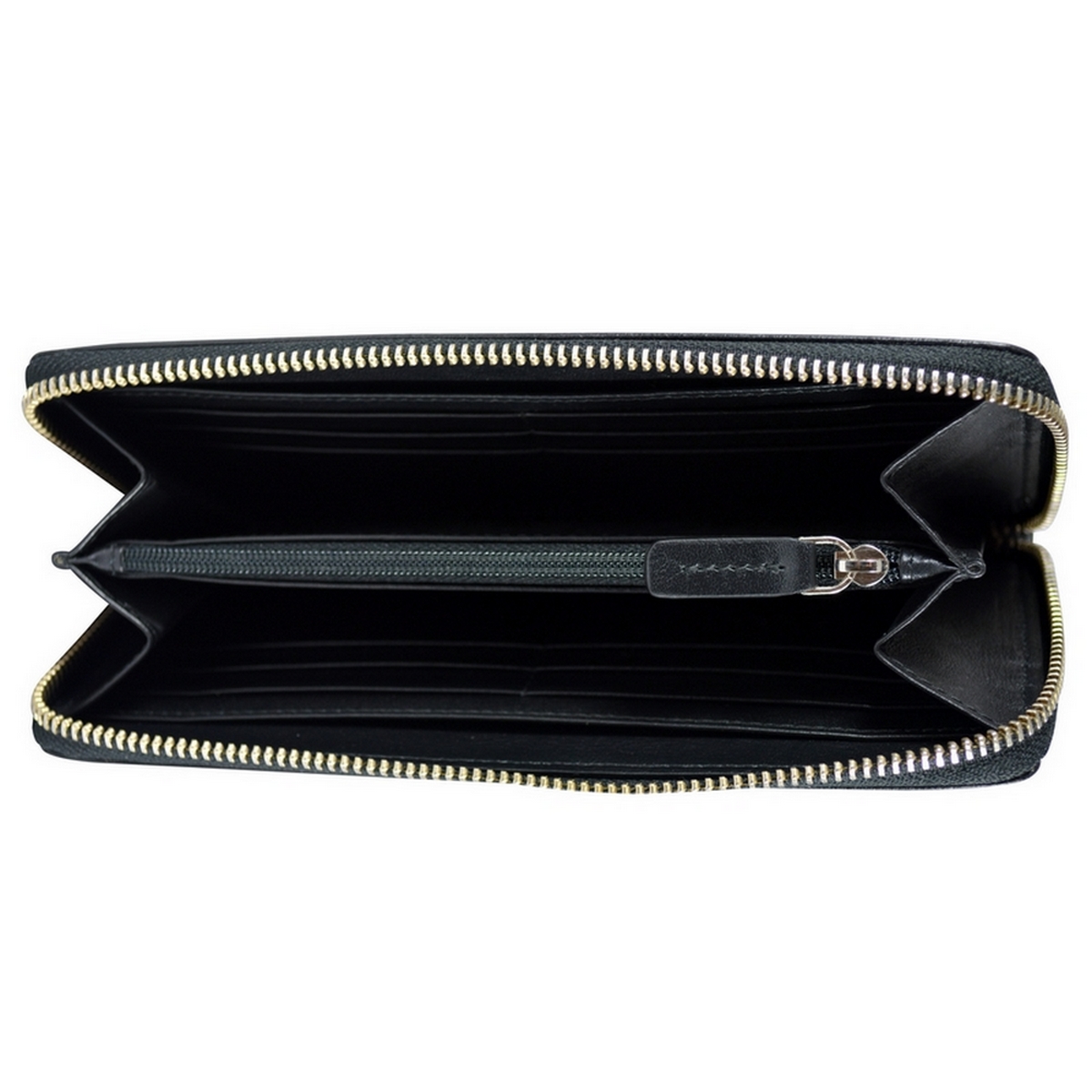Billetera de mujer realizada en cuero. Bolsillos para tarjeta de crédito. Dos compartimentos para billetes. Compartimento con cierre para monedas. Cierre de cremallera exterior. Set presentado en box de regalo.