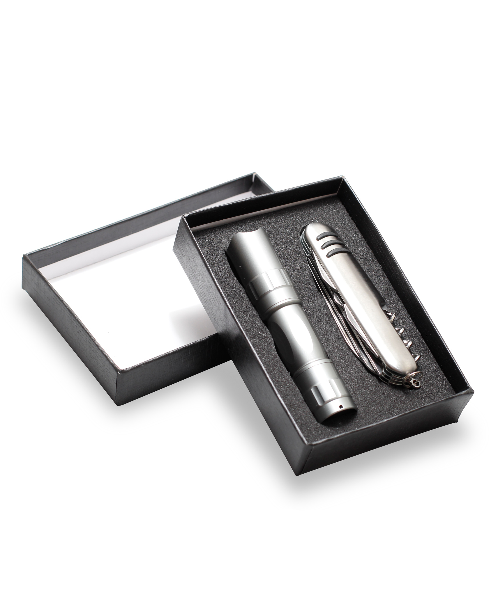 Navaja: Saca Corchos, Destornillador Philips y plano, Corta Plumas,Destapador,abre lata, y tijera. 2 serruchos, cuchilla. Linterna: Led, con aumento. Metálica, funciona con 1 pila AA, no incluida.