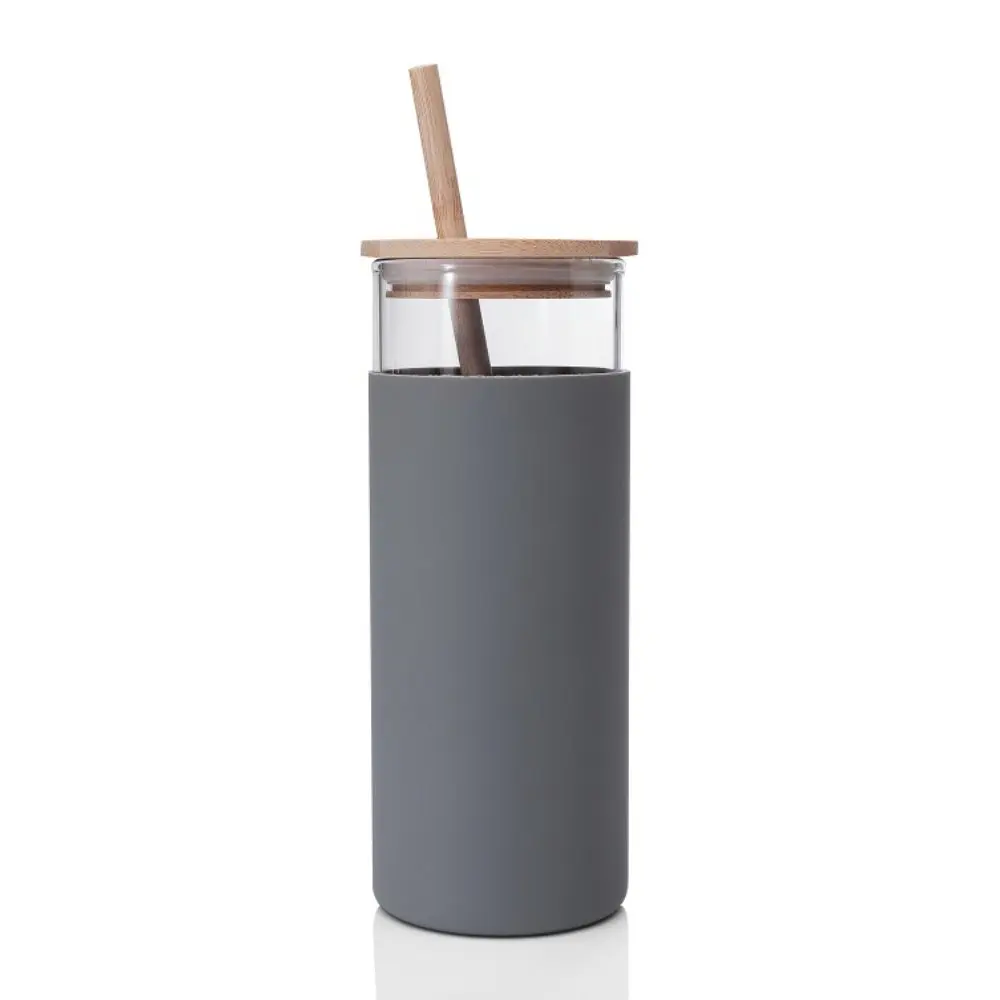Botella de vidrio borosilicato con sorbete y tapa de bamboo.