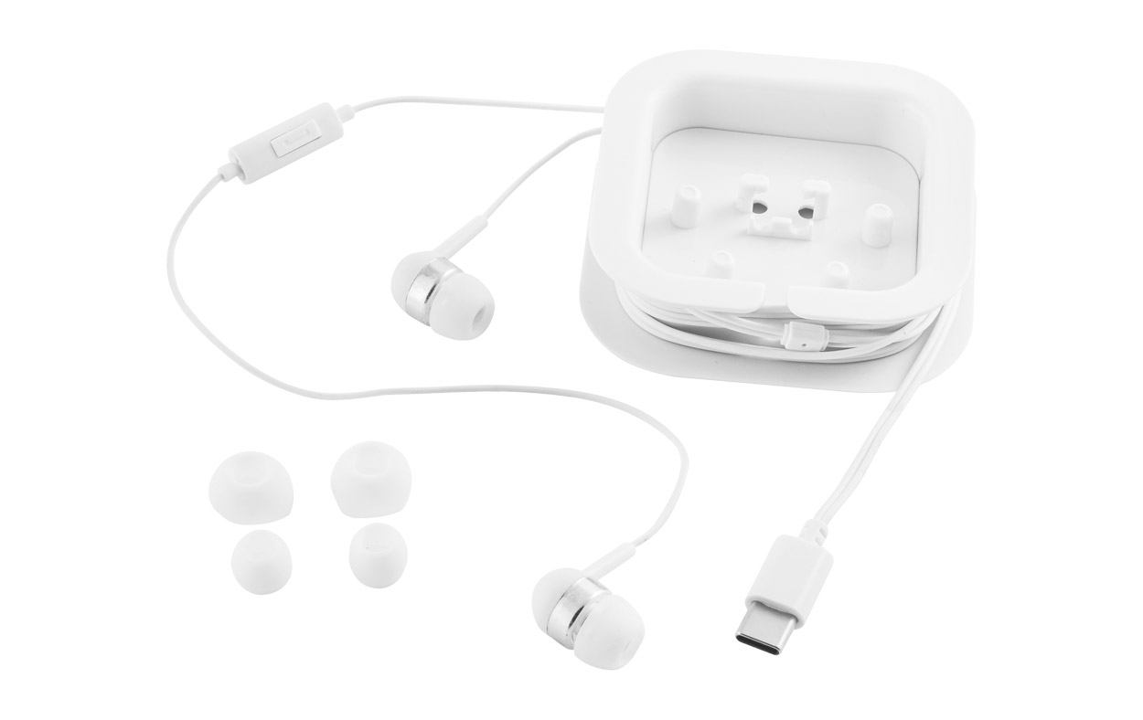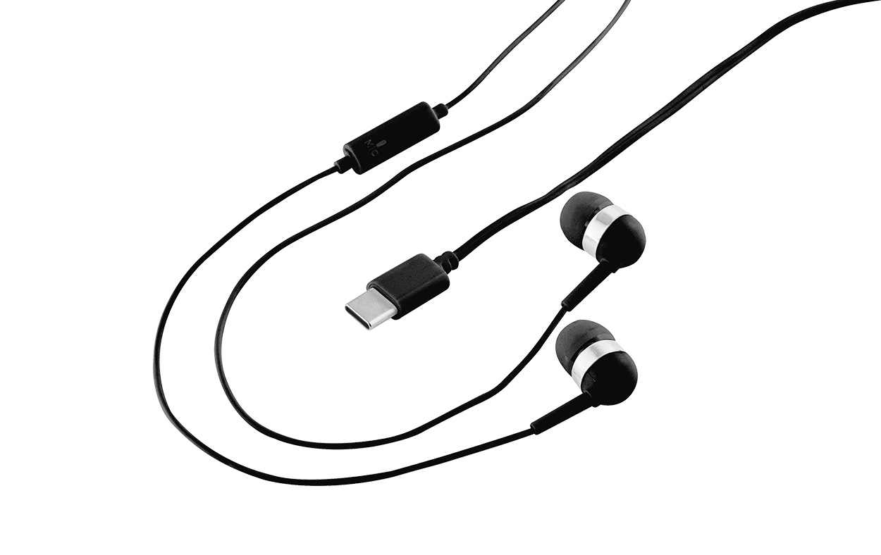 Auriculares con cable de 1,20 metros con conexión USB-C. Micrófono incorporado y botón para responder llamadas.