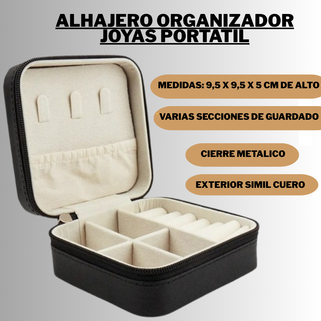Con cierre metálico para mayor seguridad. Incluye secciones para guardar: collares, anillos y pulseras o aritos.
