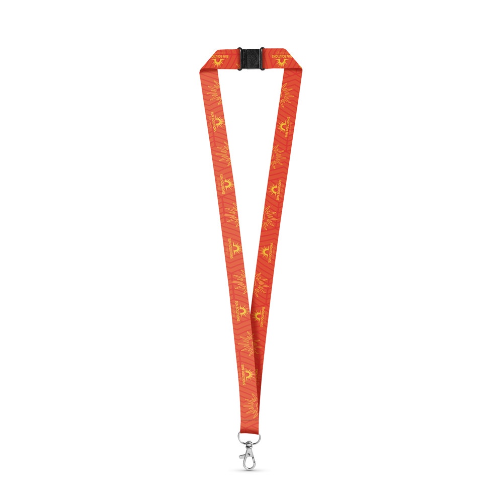 Landyard para sublimación en poliéster con mosquetón y cierre de seguridad. La personalización puede realizarse en ambos lados de la cinta. Fabricado en Europa. Los precios incluyen la personalización en sublimación. 20 x 470 mm
