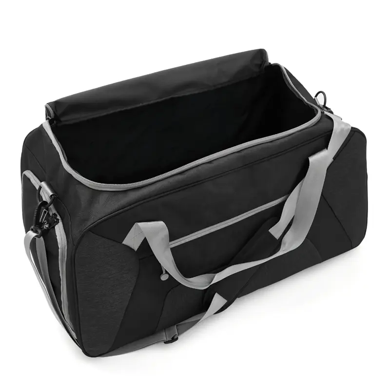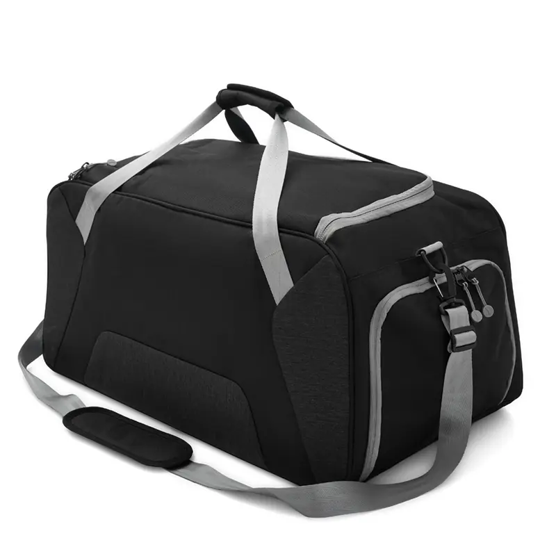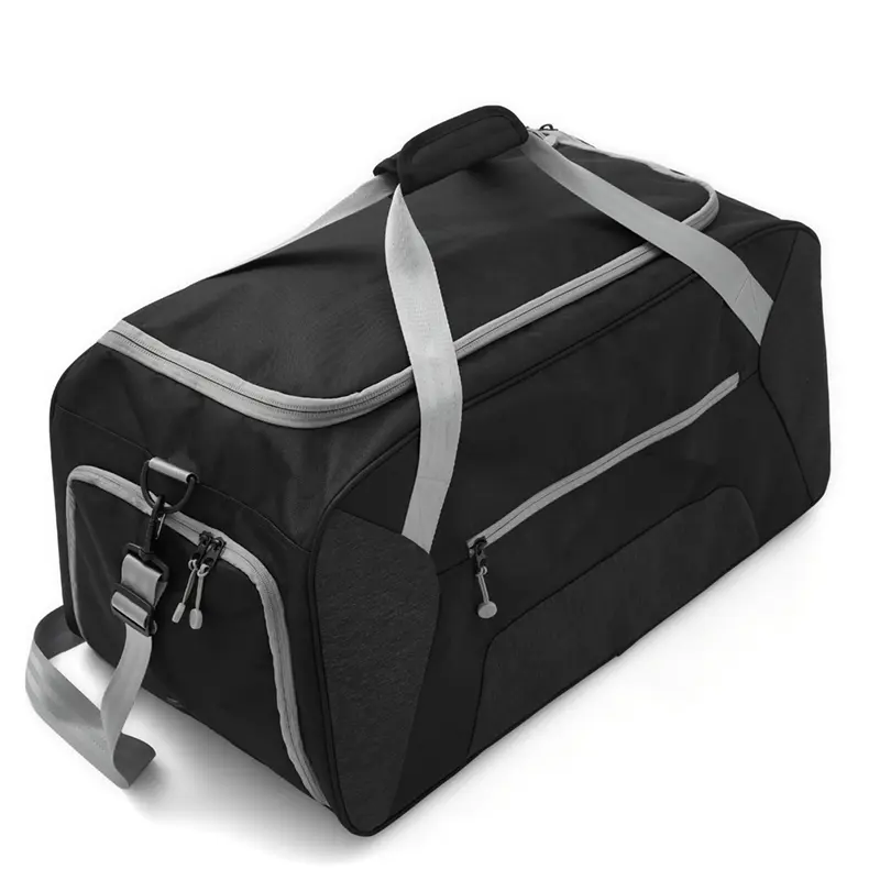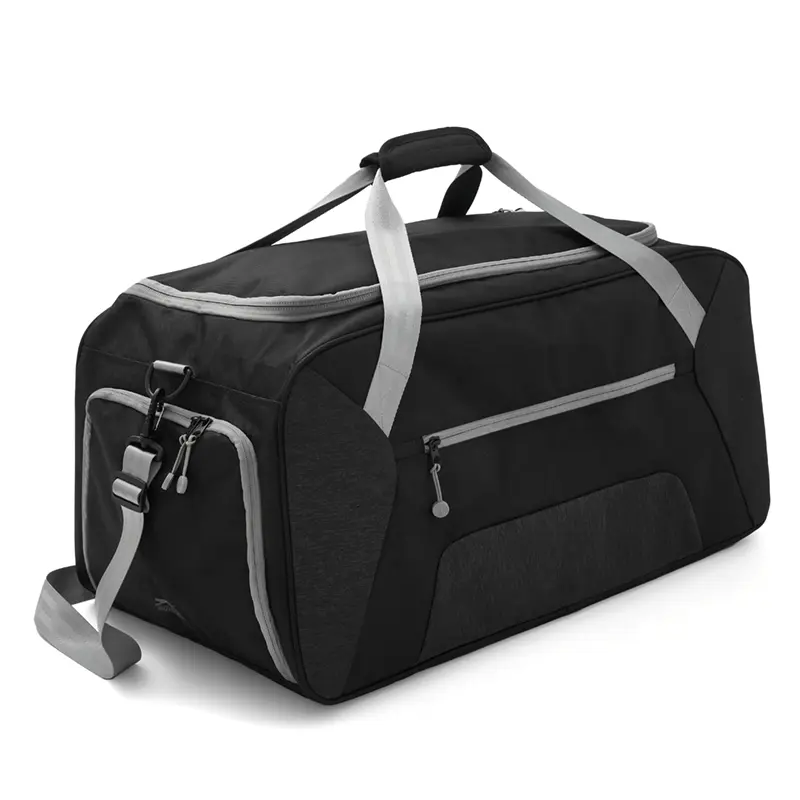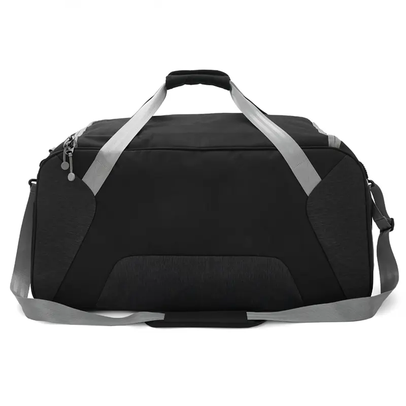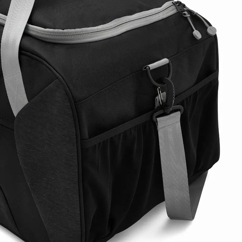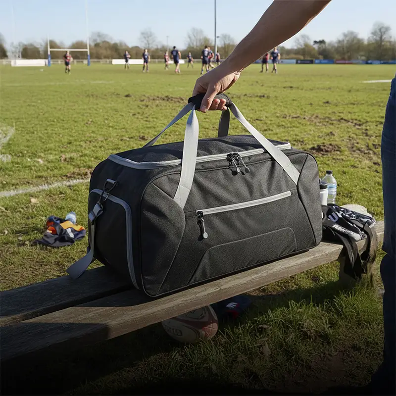 Bolso confeccionado en 168D nylon, ideal para tus actividades deportivas, viajes o giras de Rugby. Cuenta con un compartimiento principal amplio y un bolsillo frontal con cierre para objetos mas pequeños que necesites a mano. Además, tiene dos bolsillos laterales, uno de ellos con cierre, diseñado para guardar el calzado sin ensuciar le resto de tus pertenencias, y el otro, con red. Posee manijas y correa regulable, para llevarlo de la forma que te resulte más cómoda. Capacidad: 65L.